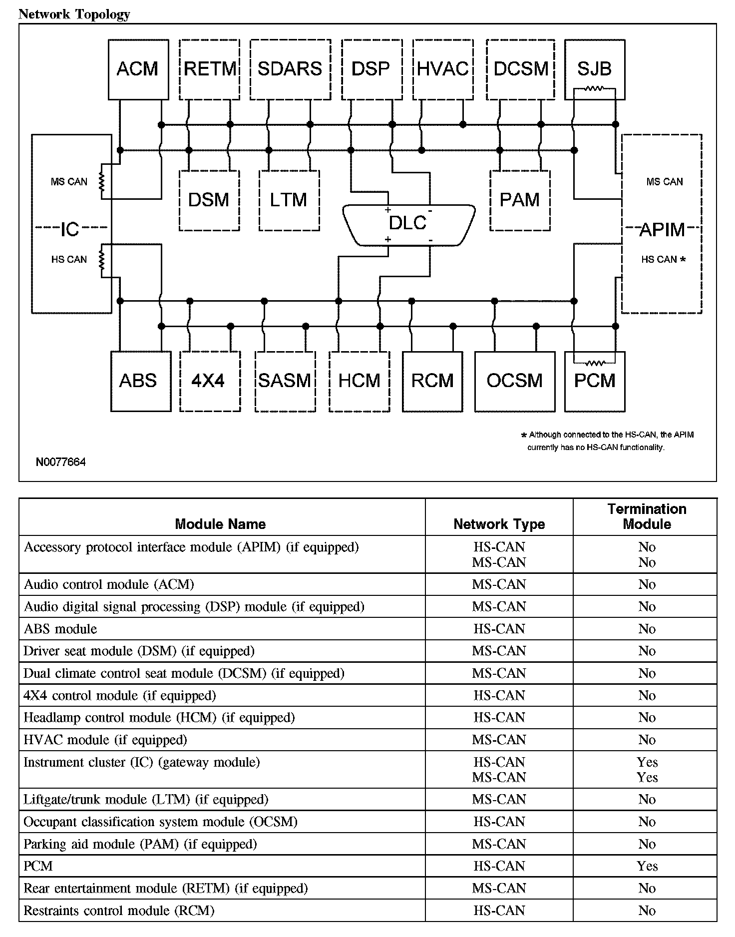 The instrument cluster is the gateway module, translating HS-CAN to MS-CAN and vice versa. This information allows a message to be distributed throughout both networks. The instrument cluster is the only module on this vehicle that has this ability.