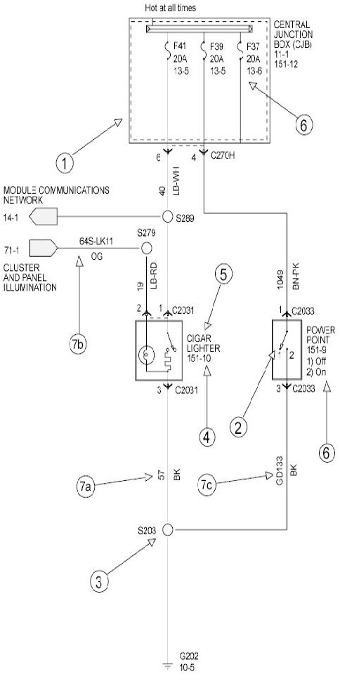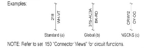 Ford Motor Company uses three different circuit numbering conventions: Standard Circuit Numbering System, Global Circuit Numbering System, and New Global Circuit Numbering System (NGCNS). With each, the circuit number (which identifies a specific circuit function) is followed by the wire color.