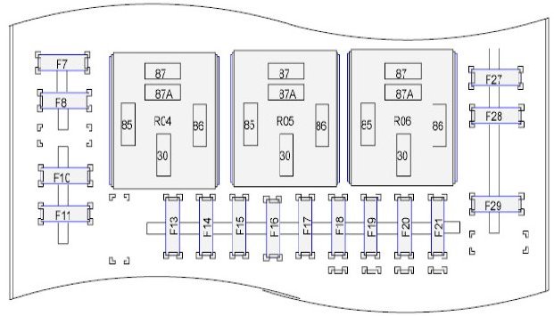Fuse/Locations and Relay/Locations contains a view of the fuse/relay box, in which all fuses and relays are identified, numbered and named. Fuse and relay numbering and naming follow the indication of the fuse panel cover. In addition, for all removable relays, pin positions are added to illustrate proper orientation.