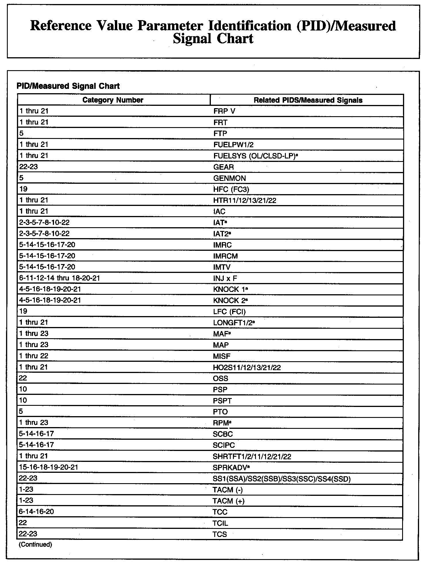 Reference Value Parameter Identification (PID)/Measured Signal Chart (Part 2):