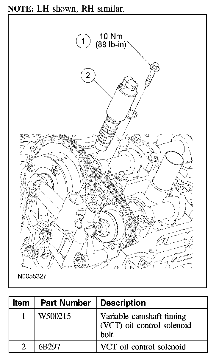 2. Remove the bolt and the variable camshaft timing (VCT) oil control solenoid.