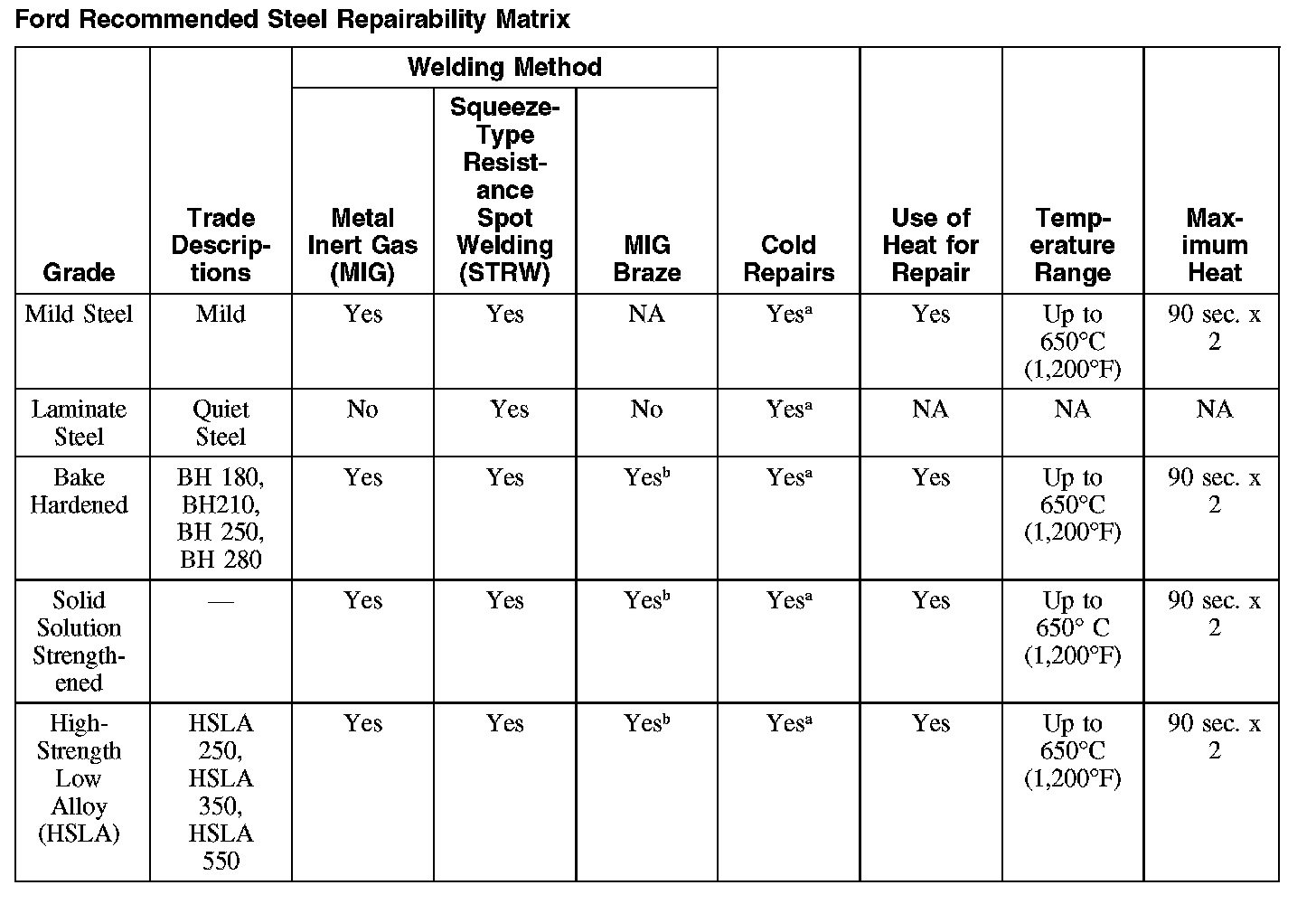 Ford Recommended Steel Repairability Matrix (Part 1):