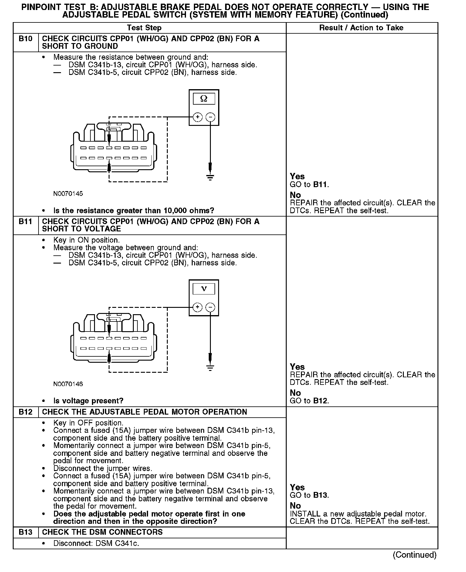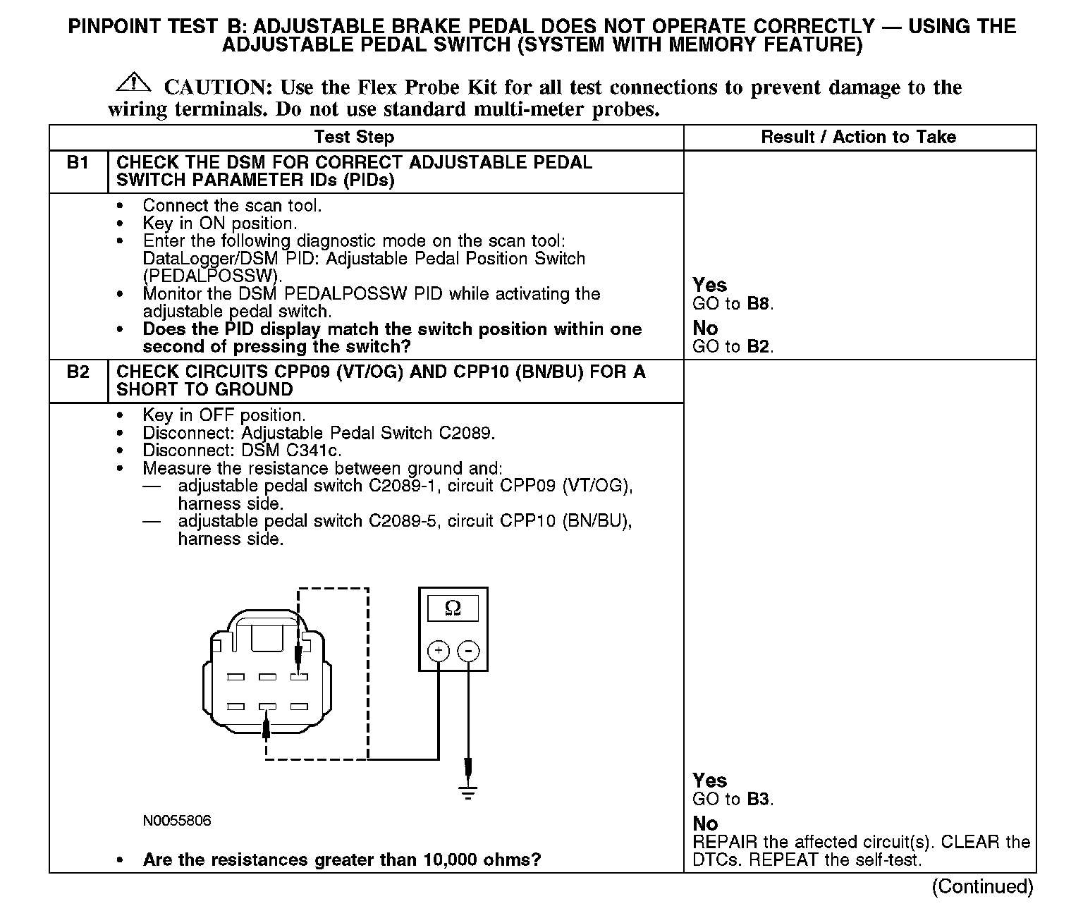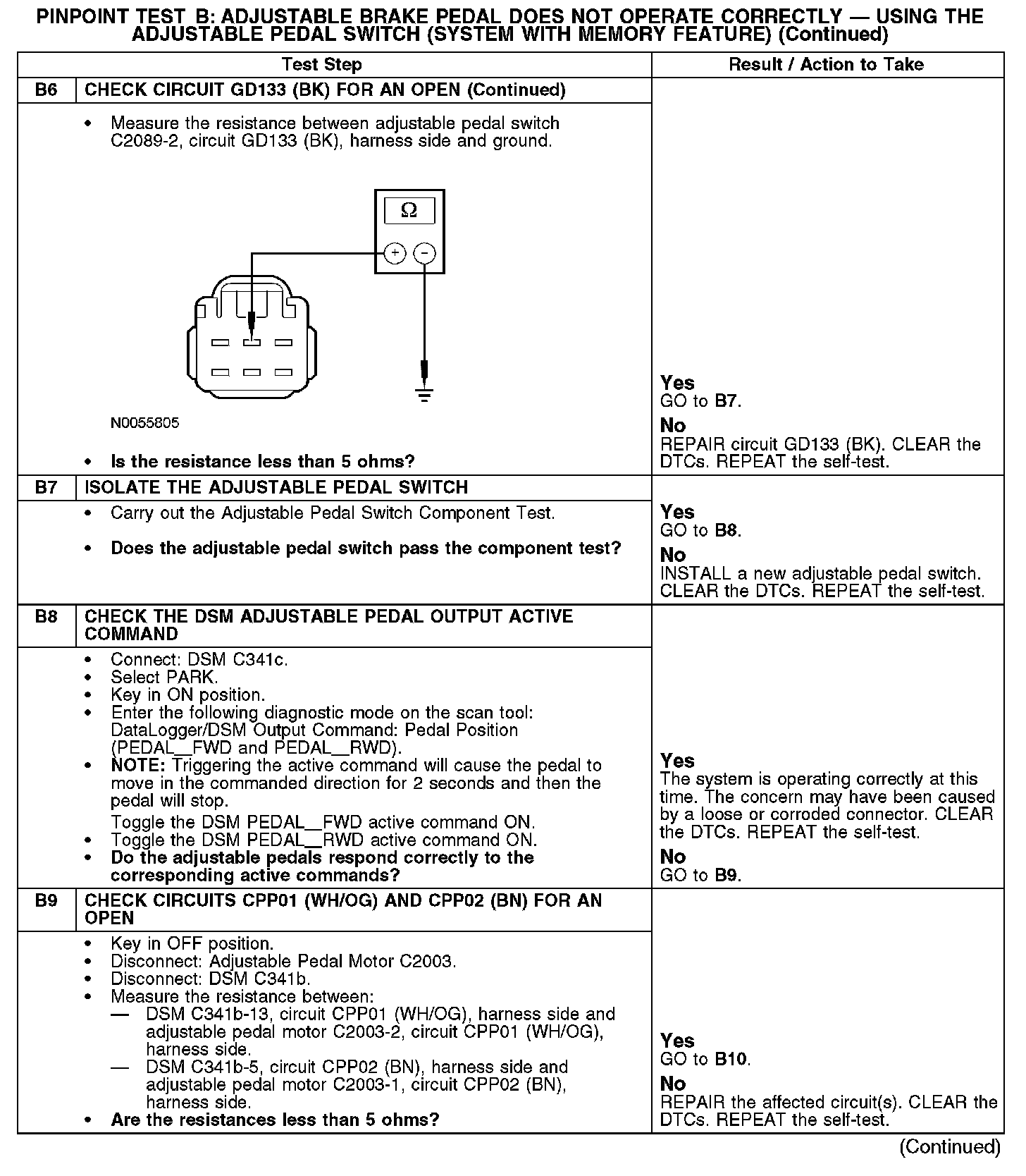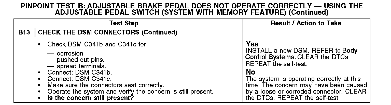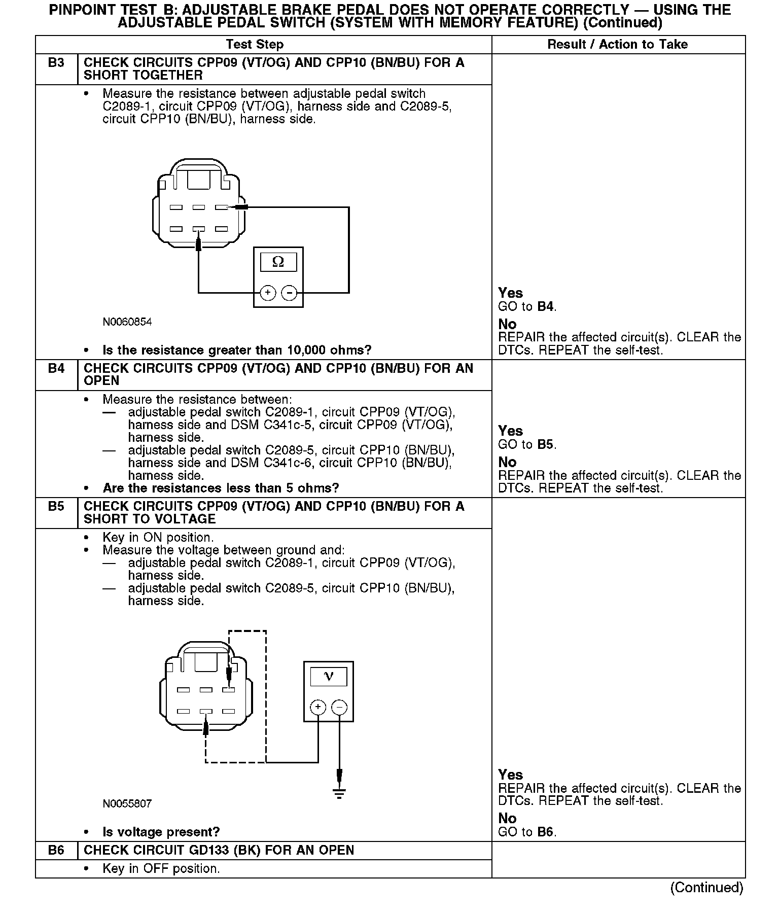 Pinpoint Test B: Adjustable Brake Pedal Does Not Operate Correctly - Using the Adjustable Pedal Switch (System with Memory Feature)Refer to Vehicle/Diagrams, Adjustable Pedals for schematic and connector information.