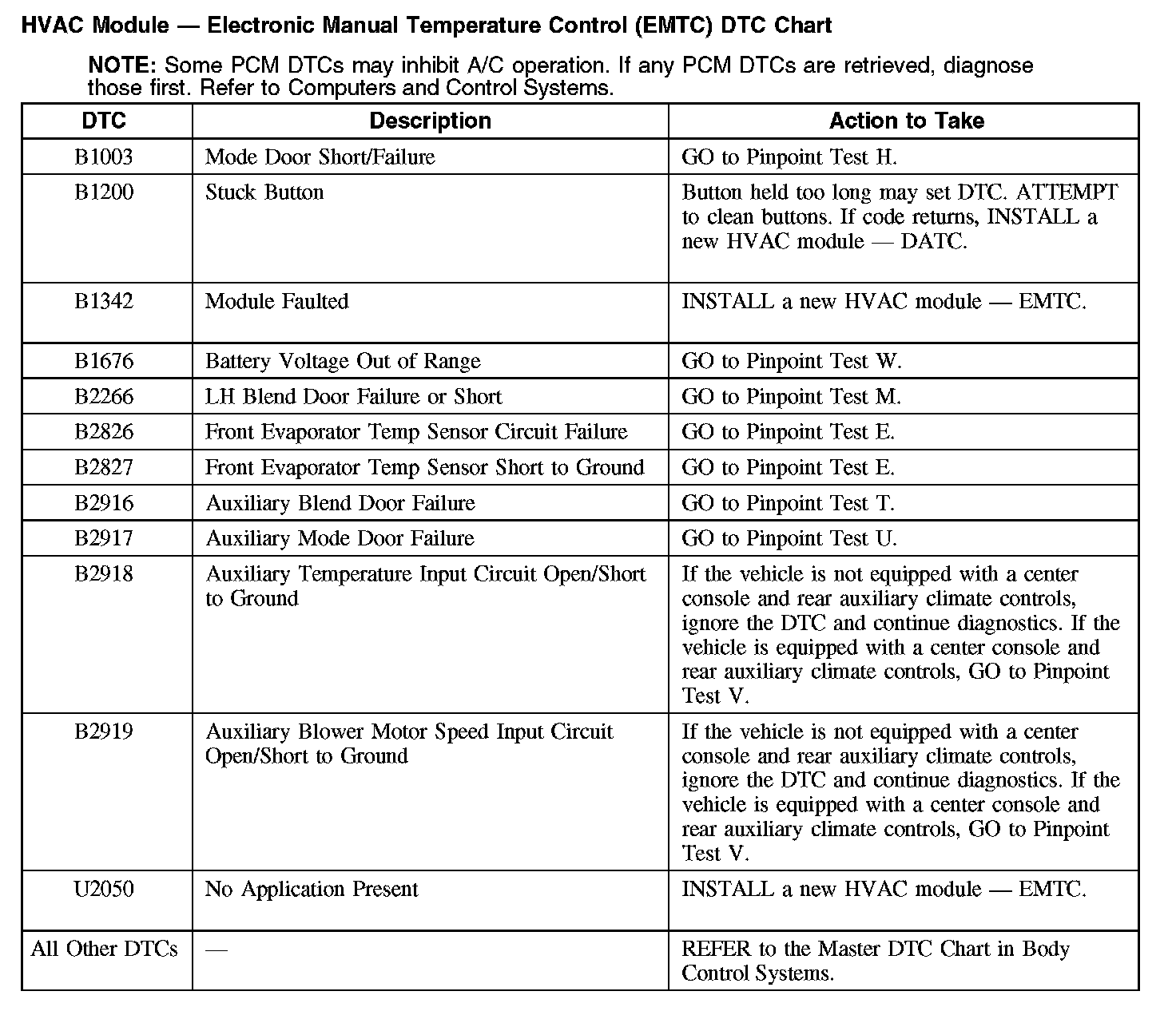 HVAC Module - Electronic Manual Temperature Control (EMTC) DTC Chart