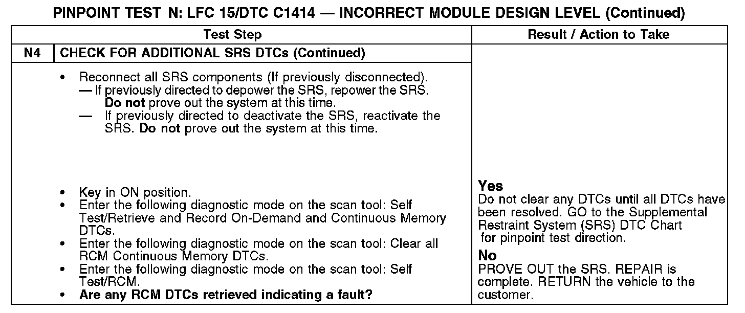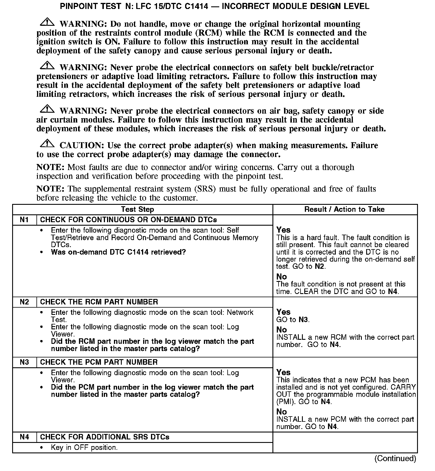 PINPOINT TEST N: LFC 15/DTC C1414 - INCORRECT MODULE DESIGN LEVELNOTE: When a new PCM is installed, the air bag warning indicator will illuminate when the ignition switch is ON. The warning indicator will remain on until PCM configuration is restored.