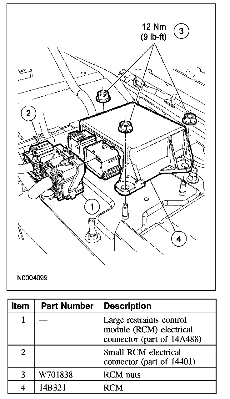 - Always tighten the fasteners of the restraints control module (RCM) and impact sensor (if equipped) to the specified torque. Failure to do so may result in incorrect restraint system operation, which increases the risk of personal injury or death in a crash.