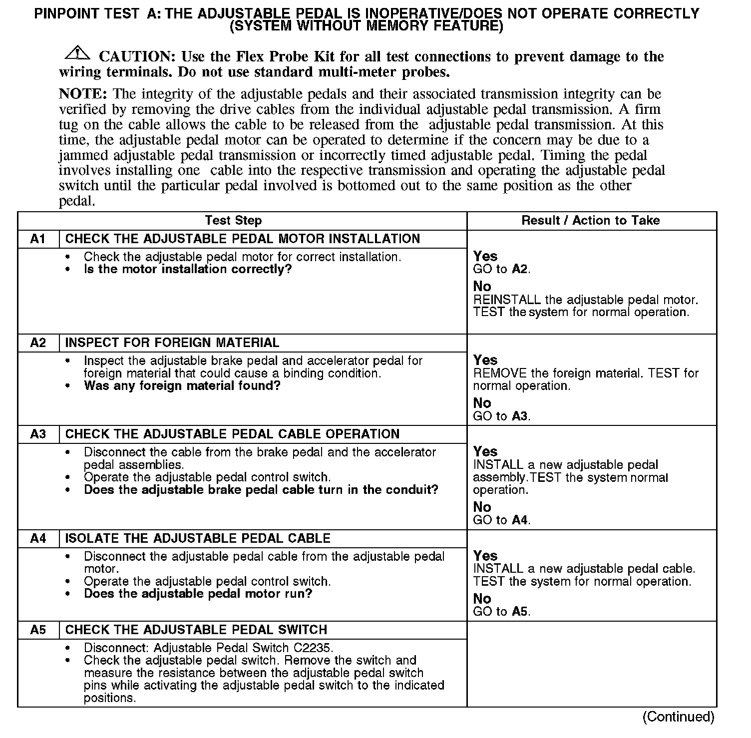 Test A: The Adjustable Pedal Is Inoperative/Does Not Operate Correctly (System Without Memory Feature)