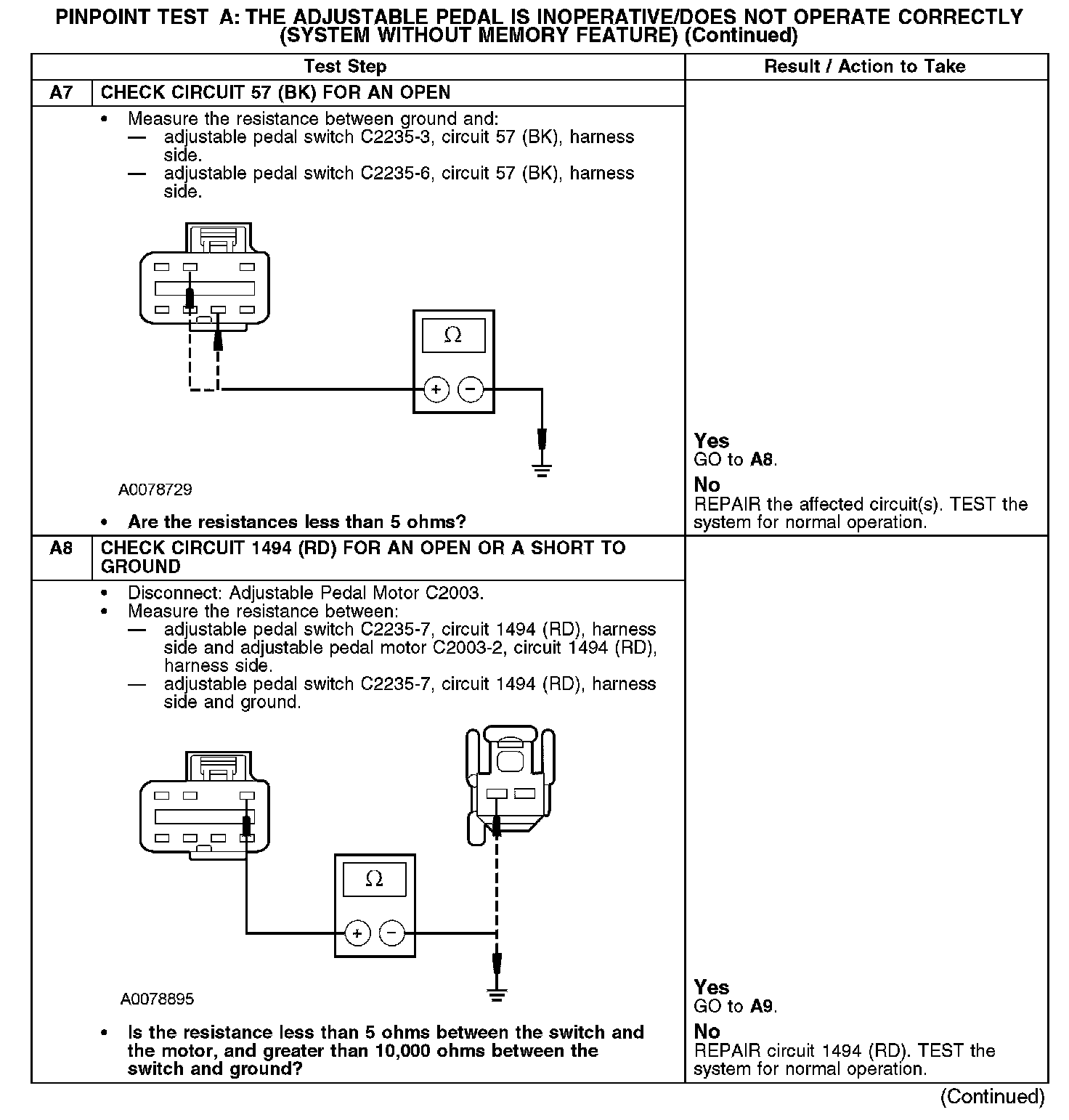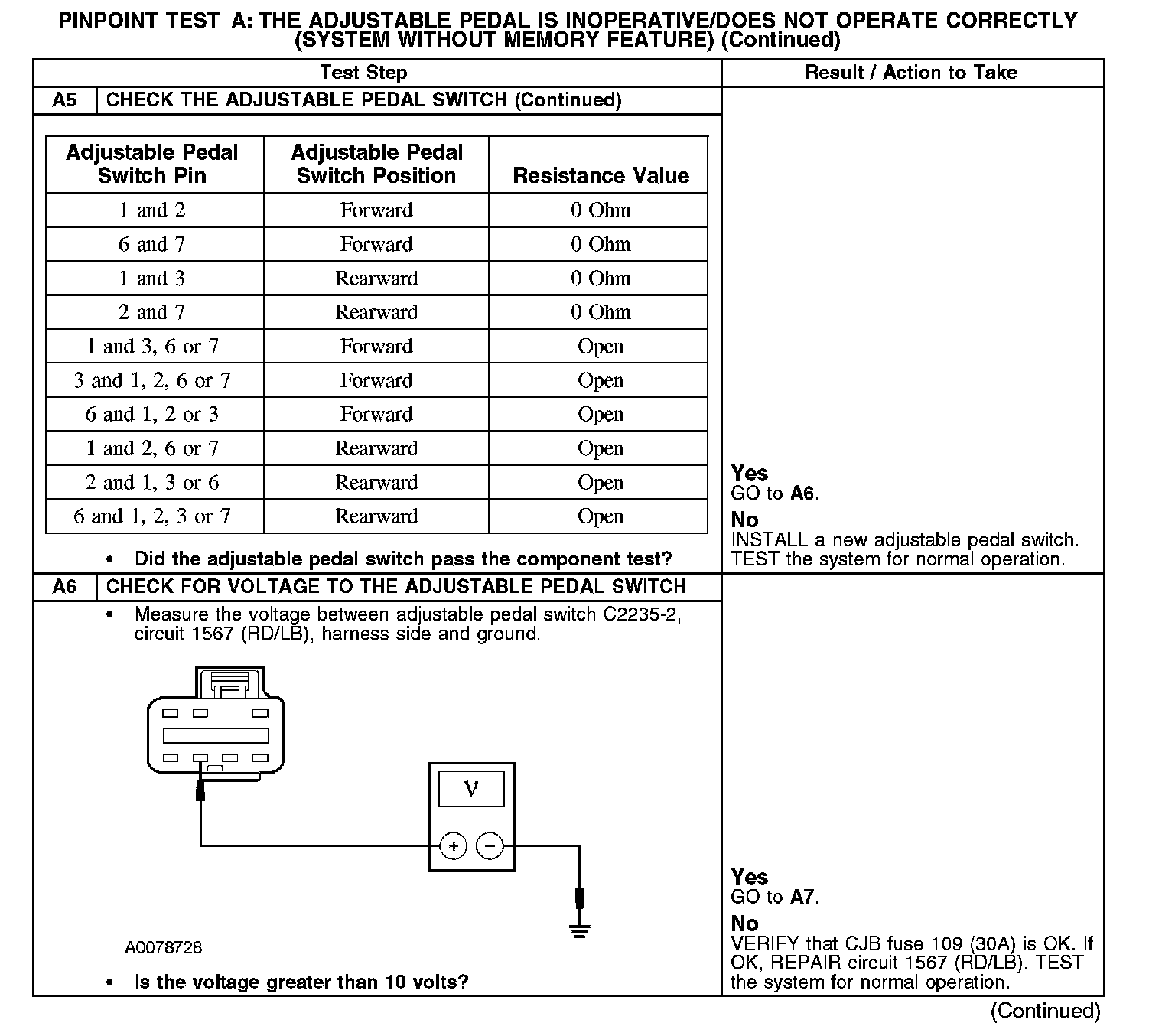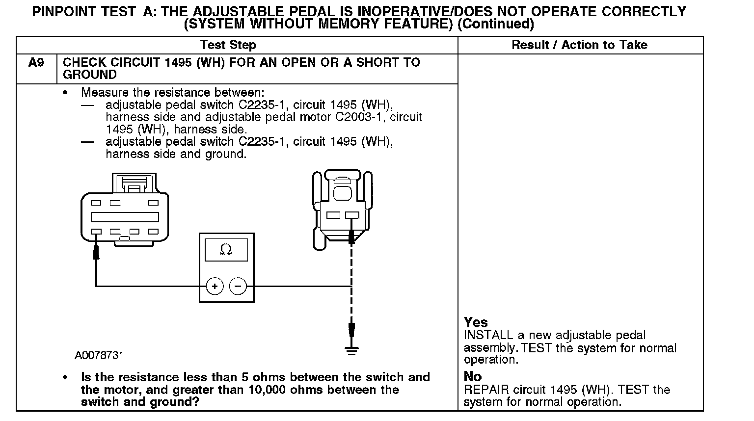 Pinpoint Test A: The Adjustable Brake Pedal is Inoperative/Does Not Operate Correctly (System Without Memory Feature)Refer to Vehicle/Diagrams, Adjustable Pedals for schematic and connector information.