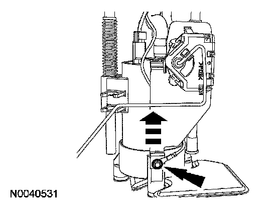 Hook the fuel level sender on the fuel pump module and install the screw through the grounding eyelet and tighten the screw. Clip the wire into the clip on the fuel pump module.
