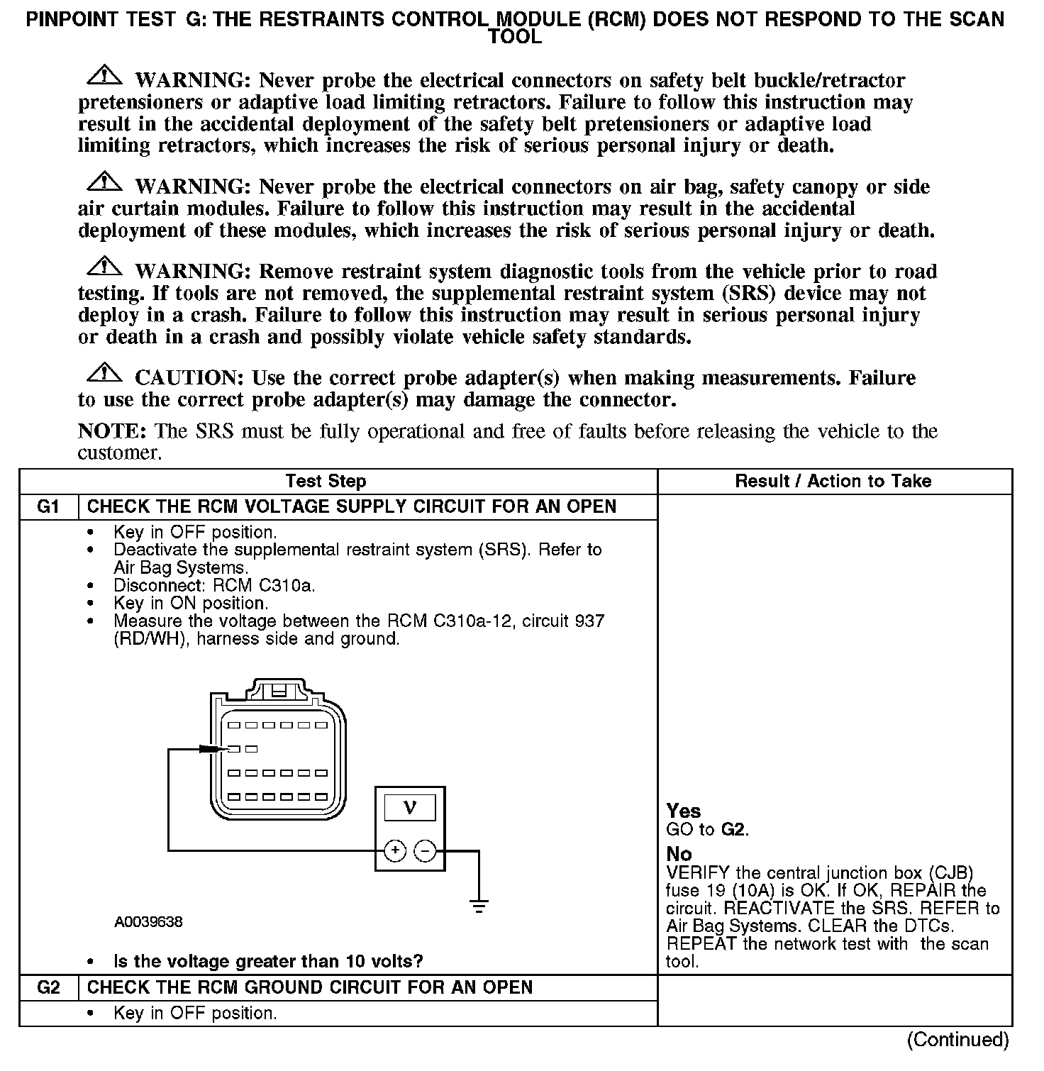 PINPOINT TEST G: THE RESTRAINTS CONTROL MODULE (RCM) DOES NOT RESPOND TO THE SCAN TOOLNormal Operation