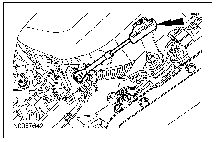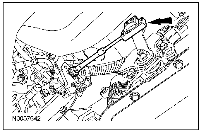 8. NOTE: When installing the selector lever cable, make sure that the selector lever cable locking tabs are locked in place and the selector lever cable end is snapped onto the ball stud. Press the selector lever cable into the selector lever cable bracket and listen for the cable to click in place. Pull back on the selector lever cable to make sure that it is locked into the selector lever cable bracket. Also make sure that the selector lever cable end is correctly installed onto the ball stud. Pull back on the selector lever cable end to make sure that the selector lever cable end is correctly installed.