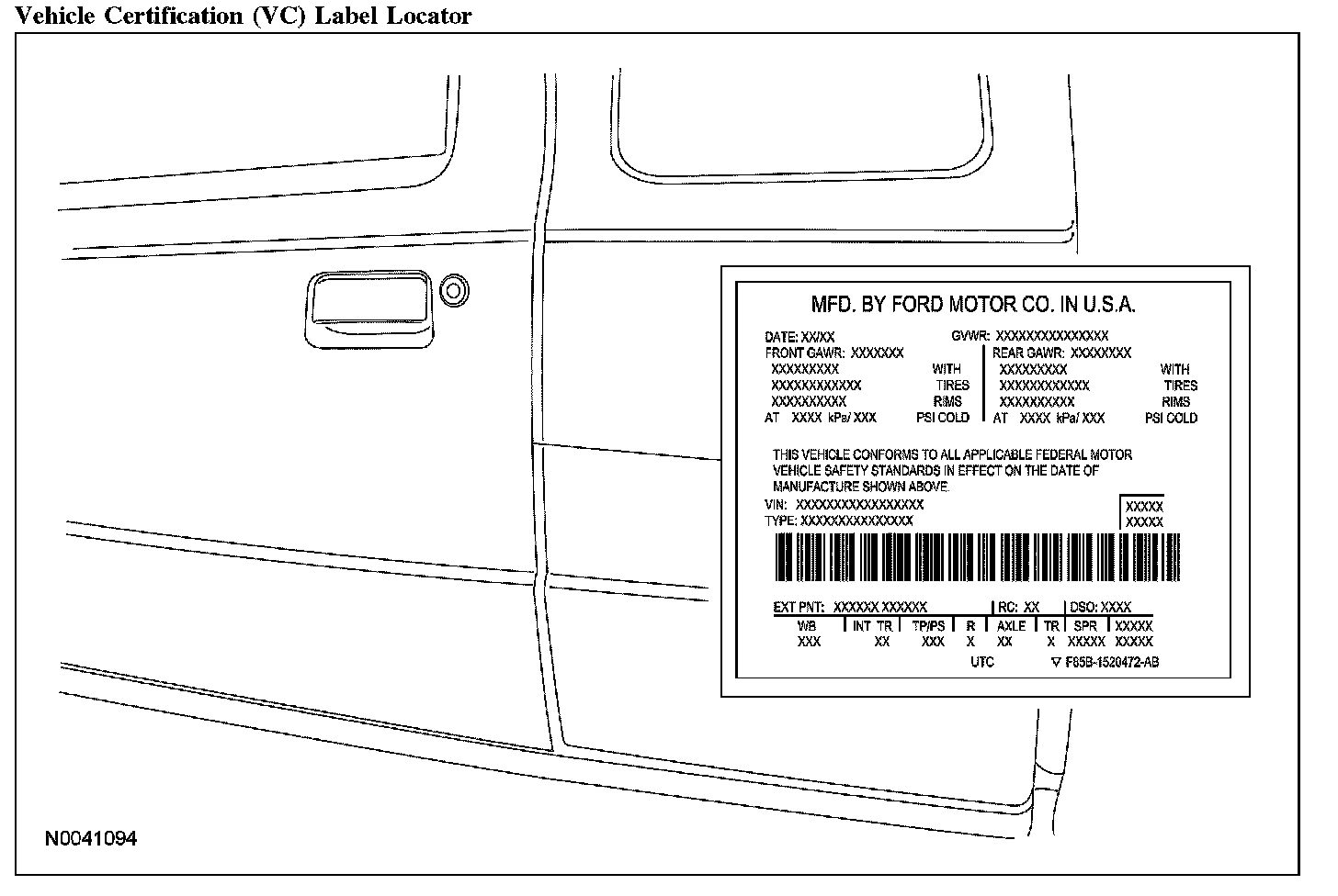 The upper portion of the vehicle certification (VC) label contains the manufacturer name, the month and year of manufacture, the certification statement and the VIN. It also includes gross vehicle weight ratings (GVWR).