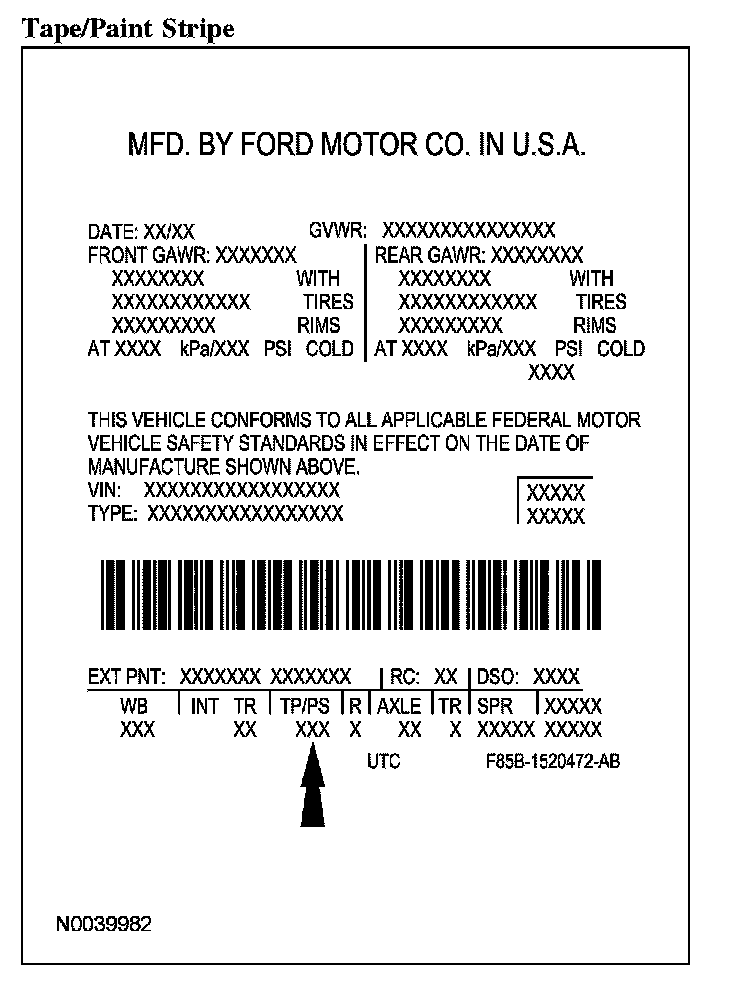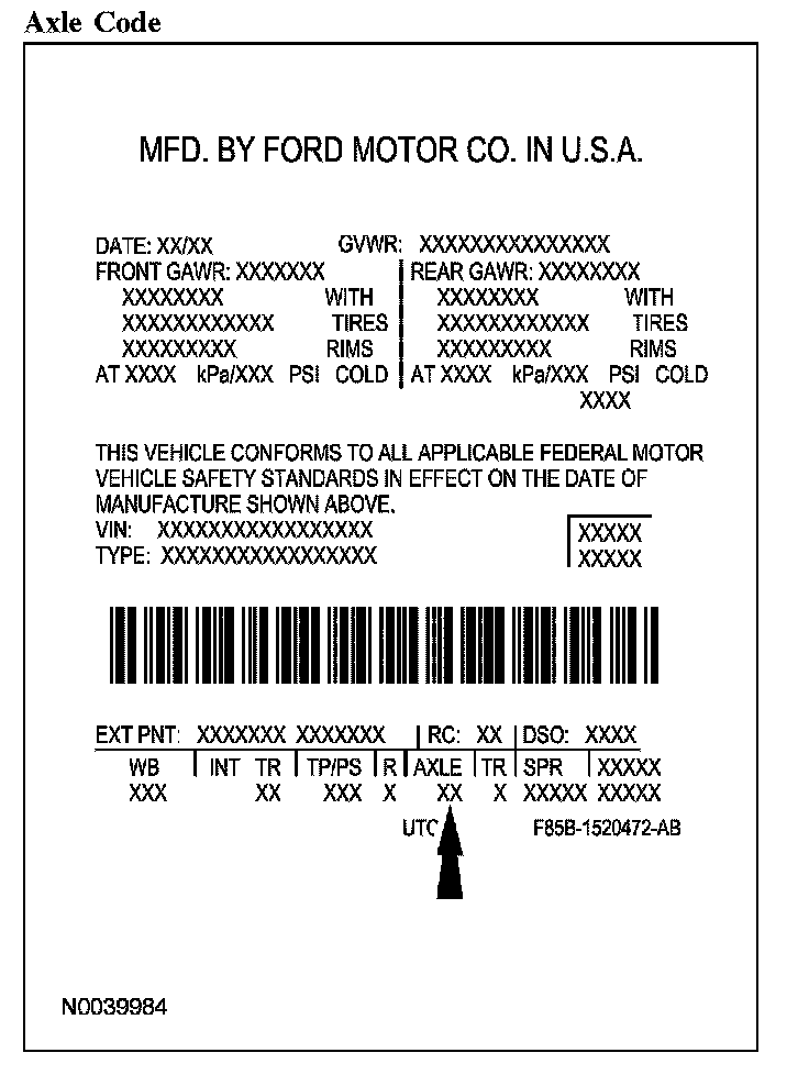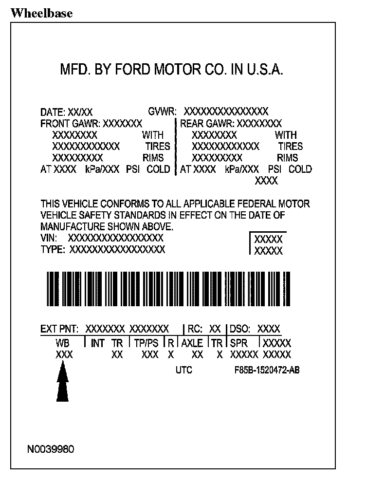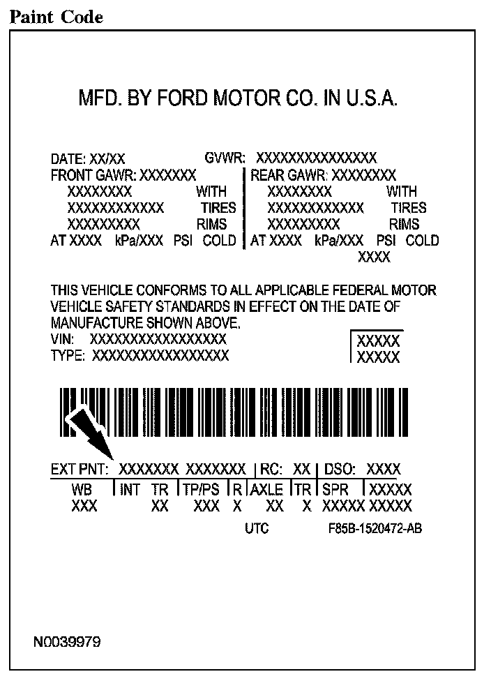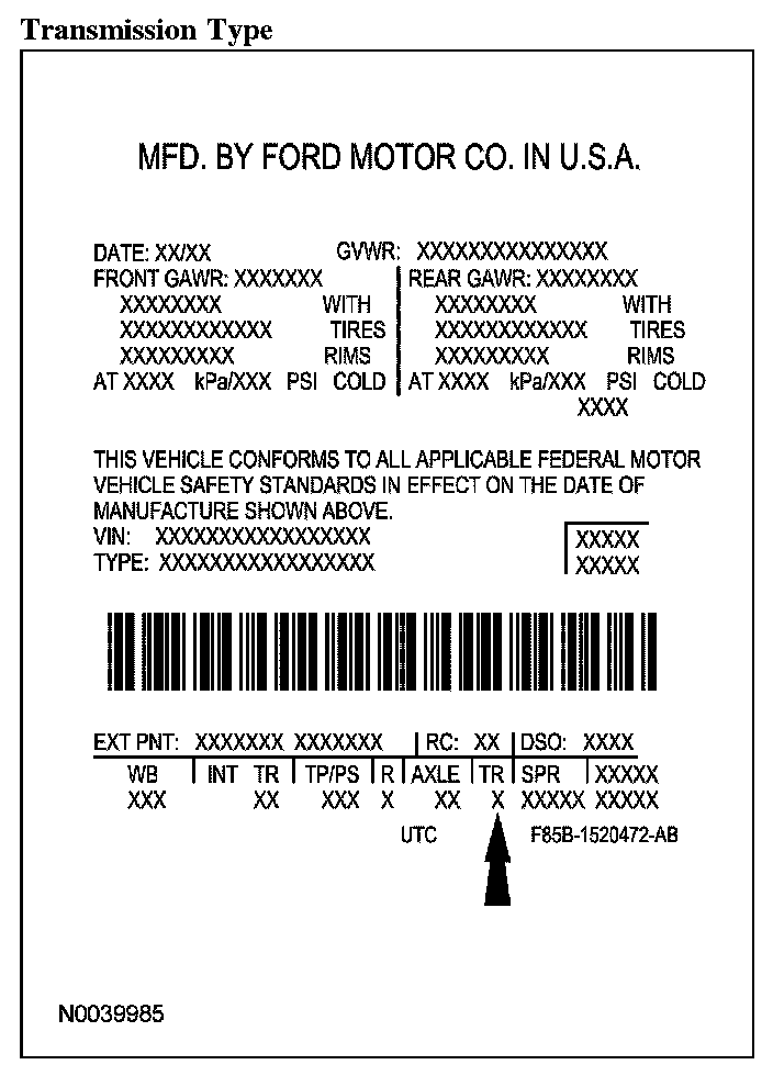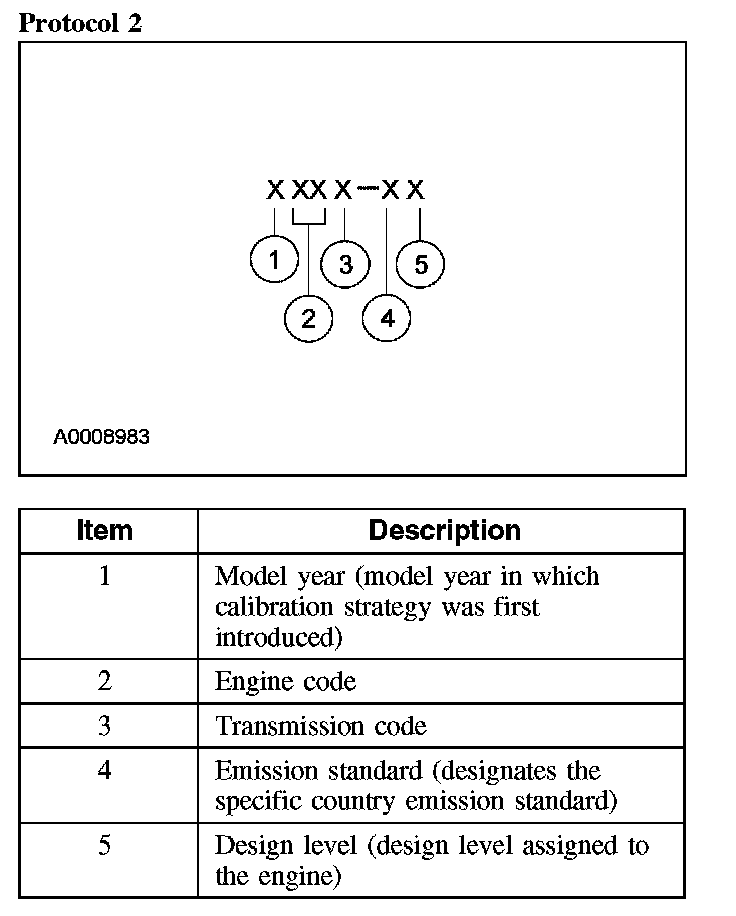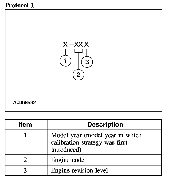 Powertrain calibration information is printed in the lower right corner of the vehicle certification label. Only the base calibration information is printed. Revision levels will not appear, however, this information can be found in On Line Automotive Service Information System (OASIS). For the current model year, Ford Motor Company is using 3 different protocols which describe powertrain base calibration. These protocols are designed to provide worldwide standardization for vehicle calibration. If the electronic calibration strategy has been used since 1998 and carried into the current model year, Protocol 1 will be used. Refer to Protocol 1 below. If the electronic calibration strategy has been used since 1999 and is carried into the current model year, Protocol 2 will be used. Refer to Protocol 2 below. Electronic calibration strategies introduced in the 2000 or later model years will use Protocol 3. Refer to Protocol 3 below.