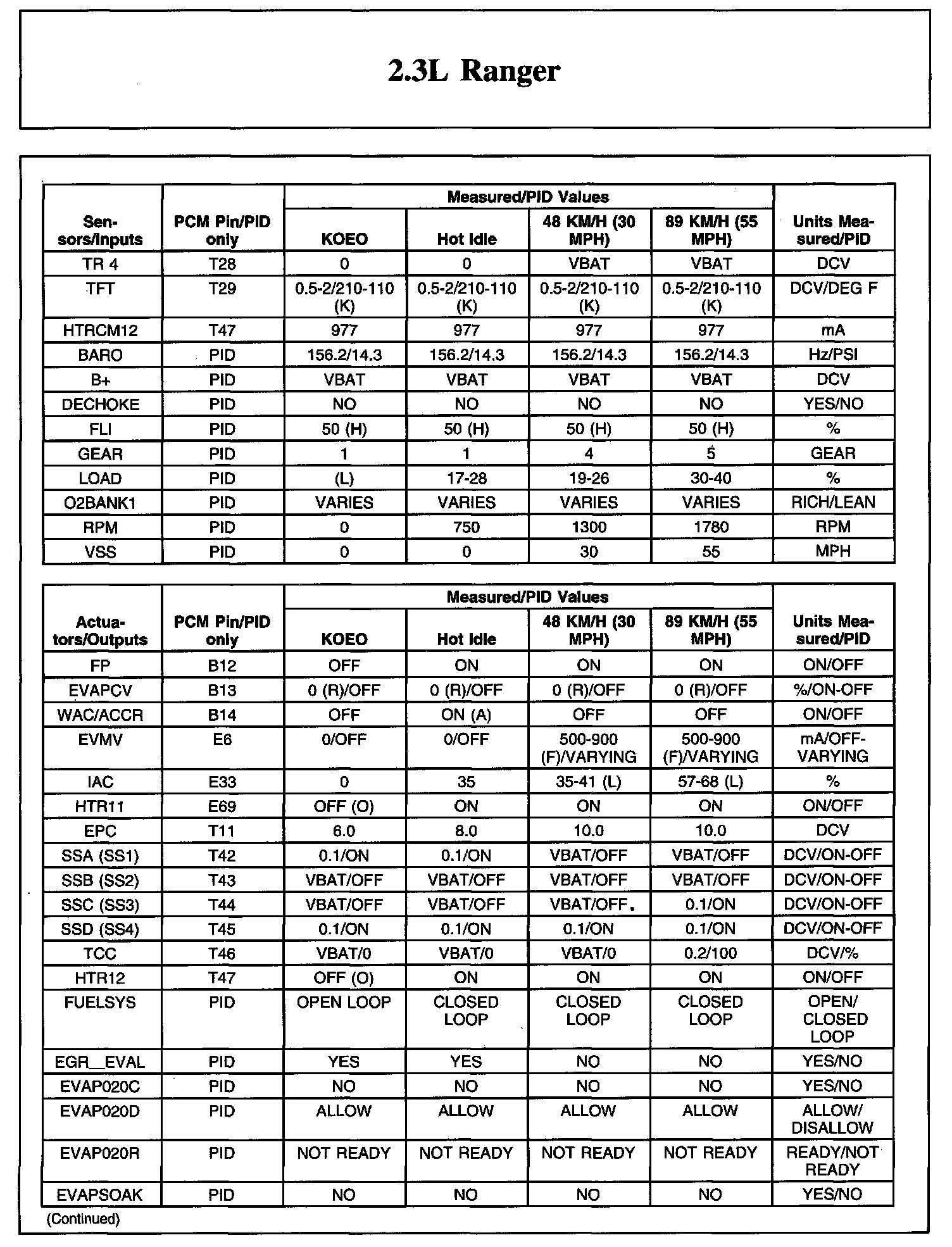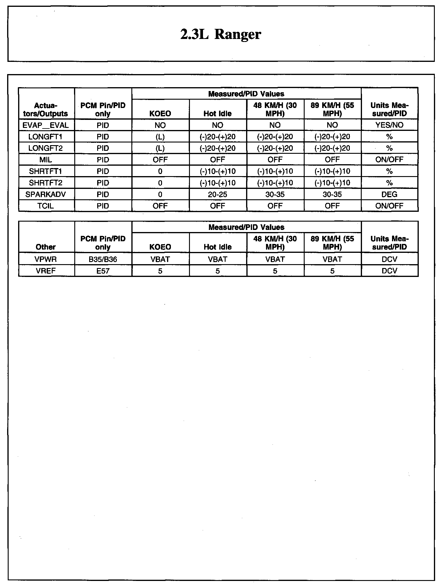 TYPICAL DIAGNOSTIC REFERENCE VALUES2.3L Ranger (Part 1):