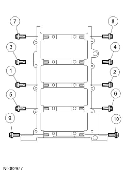 Tighten the 10 vertical main bearing cap fasteners in the sequence shown, in 2 stages: