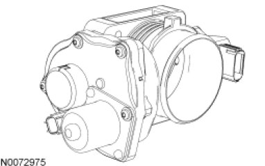 The electronic TAC is a DC motor controlled by the PCM (requires 2 wires). There are 2 designs for the TAC, parallel and in-line. The parallel design has the motor under the bore parallel to the plate shaft. The motor housing is integrated into the main housing. The in-line design has a separate motor housing. An internal spring is used in both designs to return the throttle plate to a default position. The default position is typically a throttle angle of 7 to 8 degrees from the hard stop angle. The closed throttle plate hard stop is used to prevent the throttle from binding in the bore. This hard stop setting is not adjustable and is set to result in less airflow than the minimum engine airflow required at idle. For additional information, refer to Torque Based Electronic Throttle Control (ETC) Description and Operation.