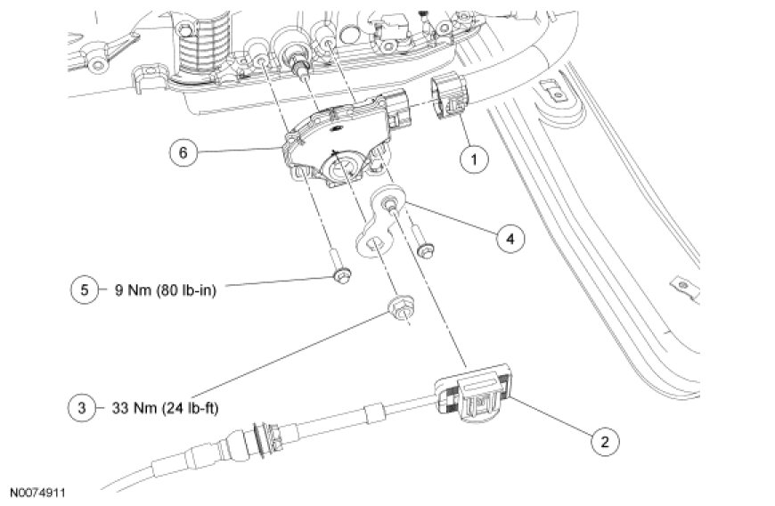 3. NOTICE: Tightening one screw before tightening the other may cause the Transmission Range (TR) sensor to bind or become damaged.