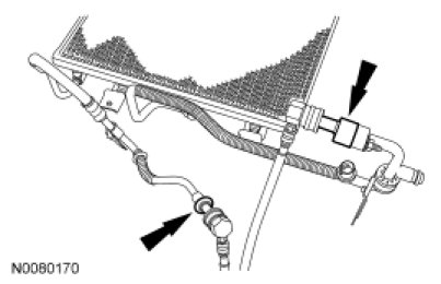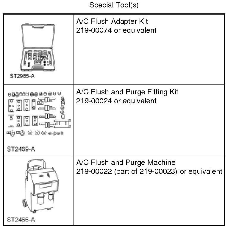 NOTE: Ford Motor Company has approved a procedure to provide technicians with a non-Chlorofluorocarbons (CFC) method of flushing contaminated A/C system heat exchangers. The procedure allows the specific components to be cleaned and flushed. The types of contamination flushed include particle matter that results from A/C compressor or desiccant failure and gummy residue that can form when refrigerant oil is overheated during A/C compressor seizure. The flushing process is a 2-step procedure that involves the use of an A/C Flush and Purge Machine 219-00022 to: