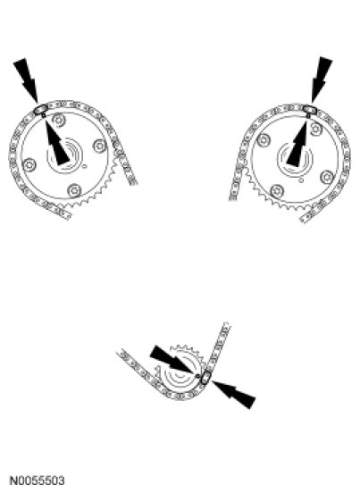 Install the primary timing chain with the colored links aligned with the timing marks on the VCT assemblies and the crankshaft sprocket.