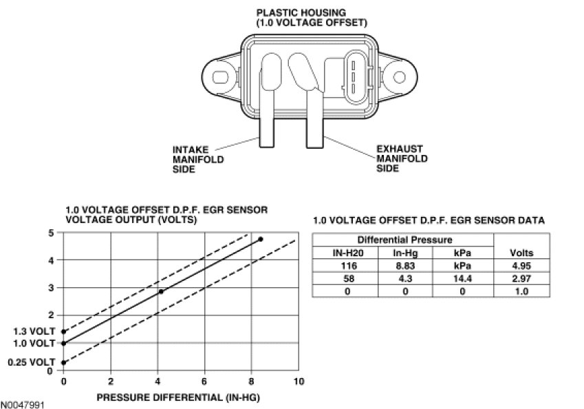 The differential pressure feedback EGR sensor is a ceramic, capacitive-type pressure transducer that monitors the differential pressure across a metering orifice located in the orifice tube assembly. The differential pressure feedback EGR sensor receives this signal through 2 hoses referred to as the downstream pressure hose (REF SIGNAL) and upstream pressure hose (HI SIGNAL). The HI and REF hose connections are marked on the differential pressure feedback EGR sensor housing for identification (note that the HI signal uses a larger diameter hose). The differential pressure feedback EGR sensor outputs a voltage proportional to the pressure drop across the metering orifice and supplies it to the PCM as EGR flow rate feedback.