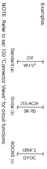 Connector Views show the views of the pins and/or cavities of all connectors. The pin and cavity sides are shown separately as if the connector were disconnected. The color of the connector housing is indicated next to the connector number when available. The harness causal number is located above the connector view and below the connector number. The circuit function charts are located below each connector. The wiring harness designations are listed in Component Location Charts.