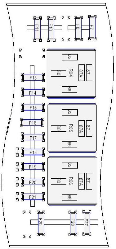 Fuse/Locations and Relay/Locations contains a view of the fuse/relay box, in which all fuses and relays are identified, numbered and named. Fuse and relay numbering and naming follow the indication of the fuse panel cover. In addition, for all removable relays, pin positions are added to illustrate proper orientation.