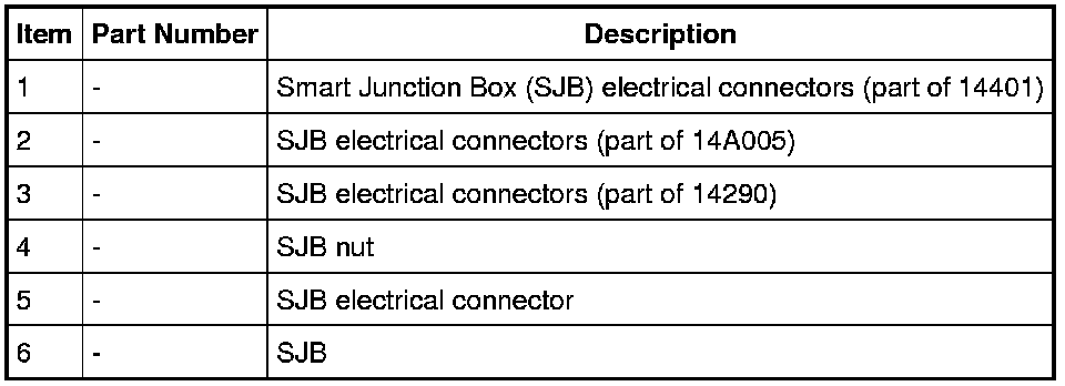 NOTE: The steps included in the SJB removal and installation procedure are critical to restoring the vehicle security and tire pressure monitoring systems to normal operation. A new SJB is delivered in a manufacturing mode with 8 pre-set DTCs related to the TPMS. To clear the DTCs, successful configuration of the SJB must occur, followed by successful TPMS sensor training, and a successful self-test, including clearing of the DTCs. The DTCs are as follows: