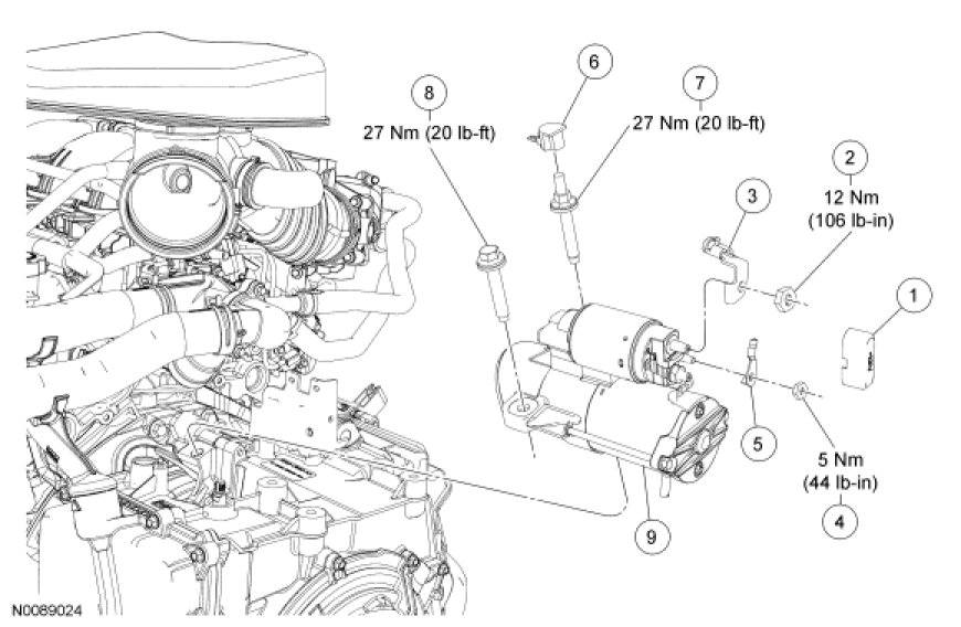 10. Remove the starter motor bolt, stud bolt and the starter.