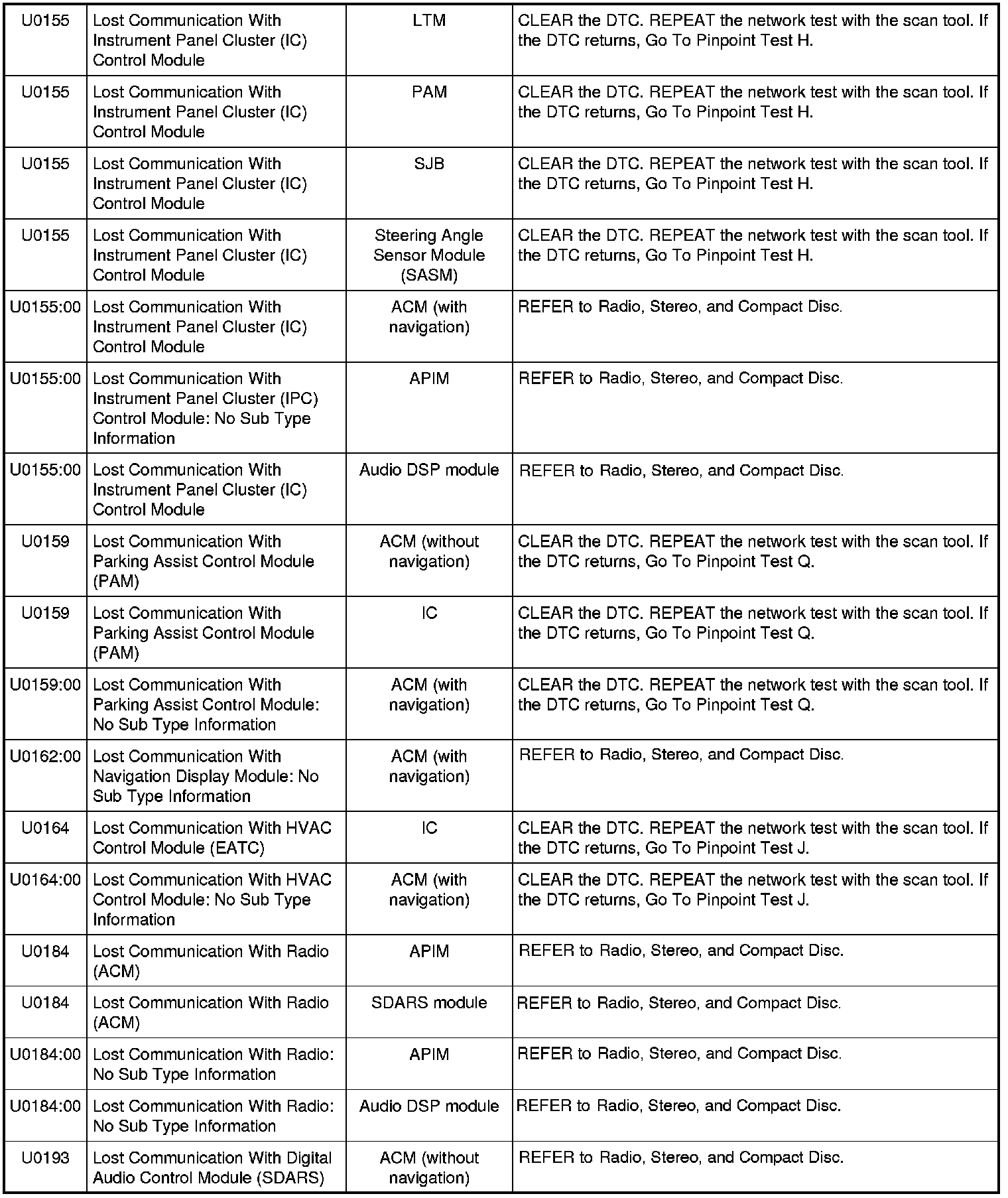 NOTE: Network DTCs (U-codes) are often a result of intermittent concerns such as faulty wiring or low battery voltage occurrences. Additionally, vehicle service procedures such as module reprogramming will often set network DTCs. Replacing a module to resolve a network DTC is unlikely to resolve the concern. To prevent repeat network DTC concerns, inspect all network wiring, especially connectors. Test the vehicle battery, refer to Battery.