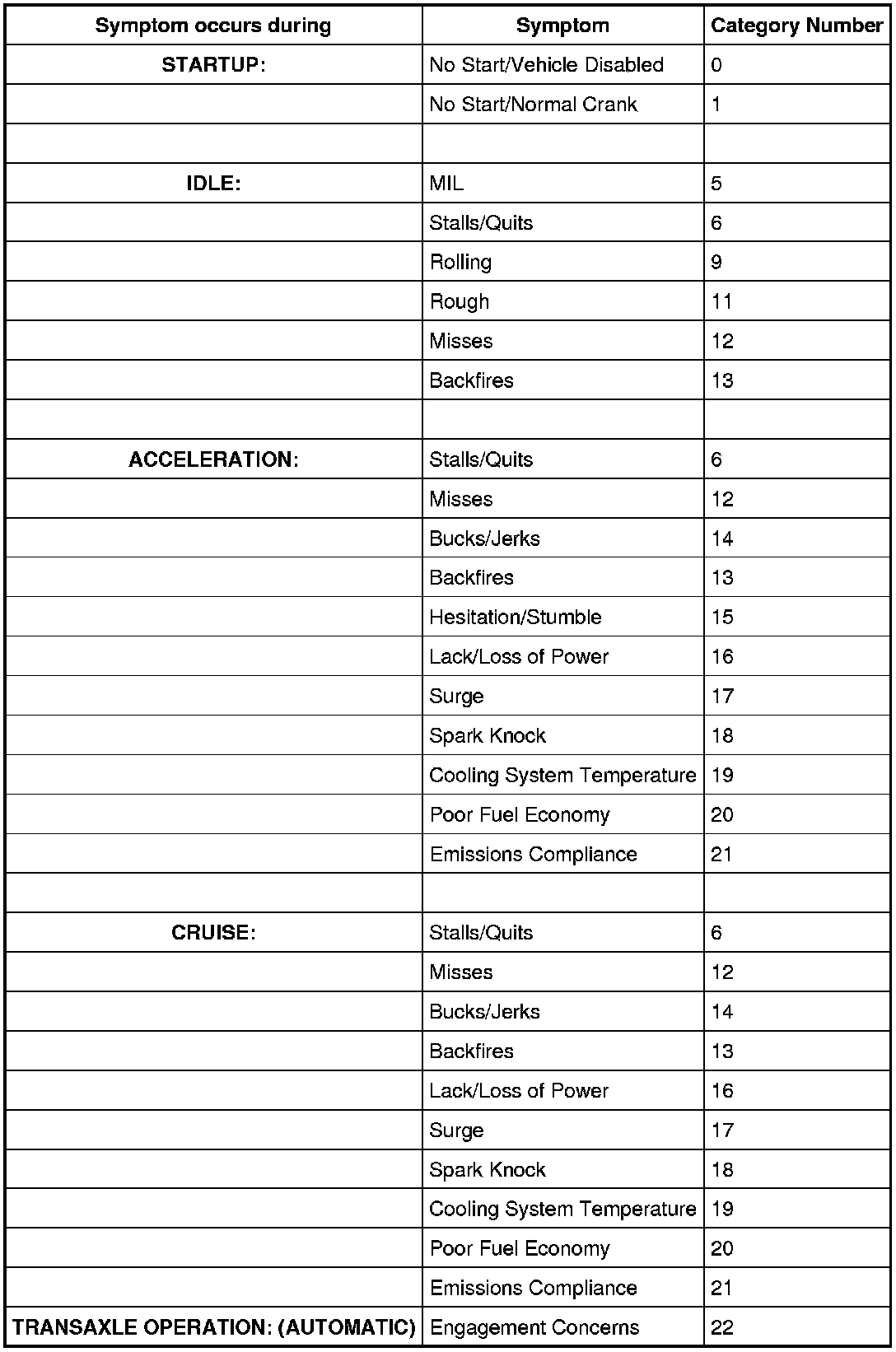 The Reference Value Symptom Chart provides guidance in selecting the appropriate parameter identification (PID) or measured signal related to the fault area. Select a symptom from the symptom chart along with the category number and go to the PID/Measured Signal Chart. For multiple symptoms, select the symptom that is most evident.