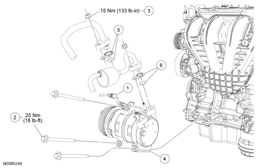 - To install, tighten the A/C compressor bolts to 25 Nm (18 lb-ft).