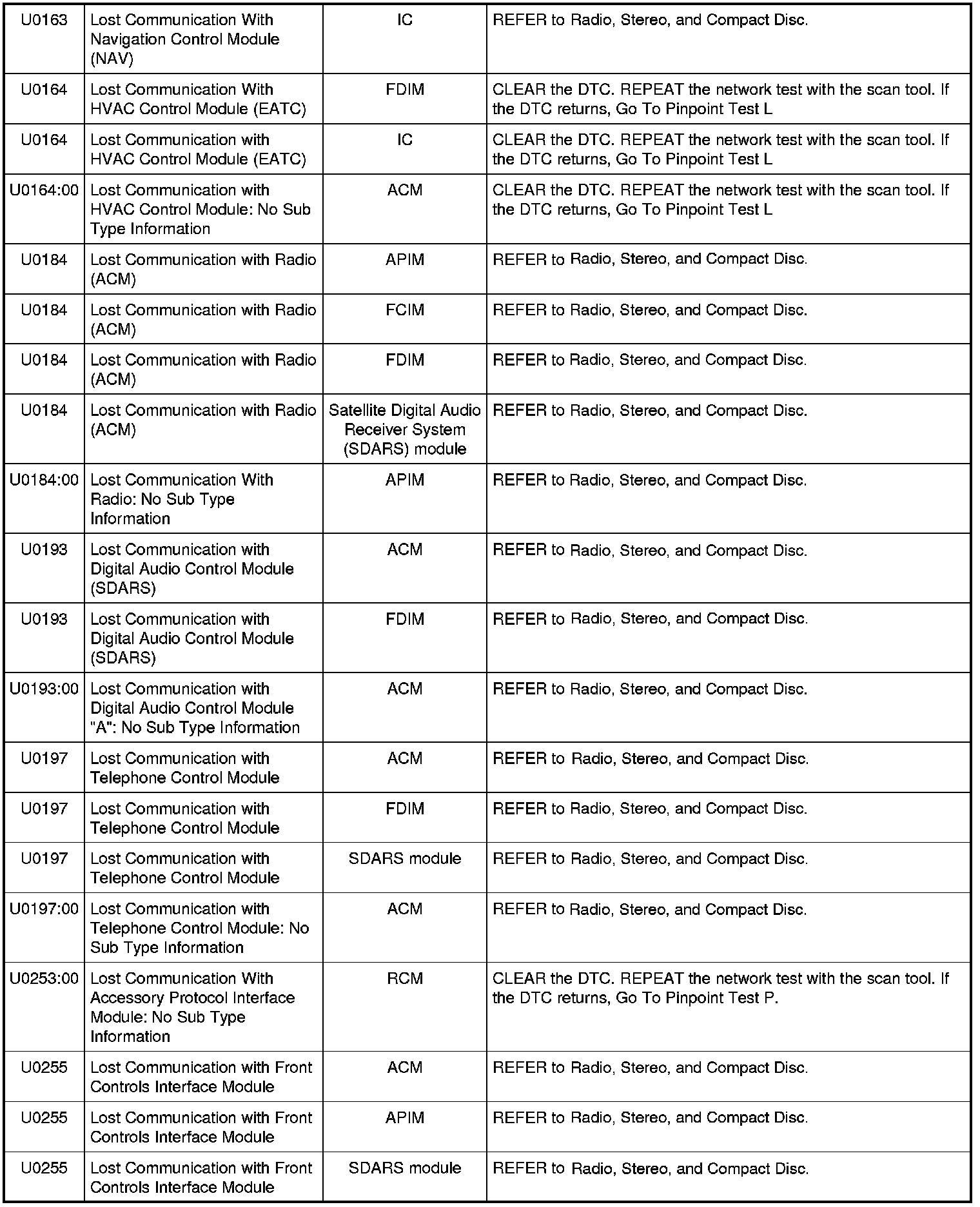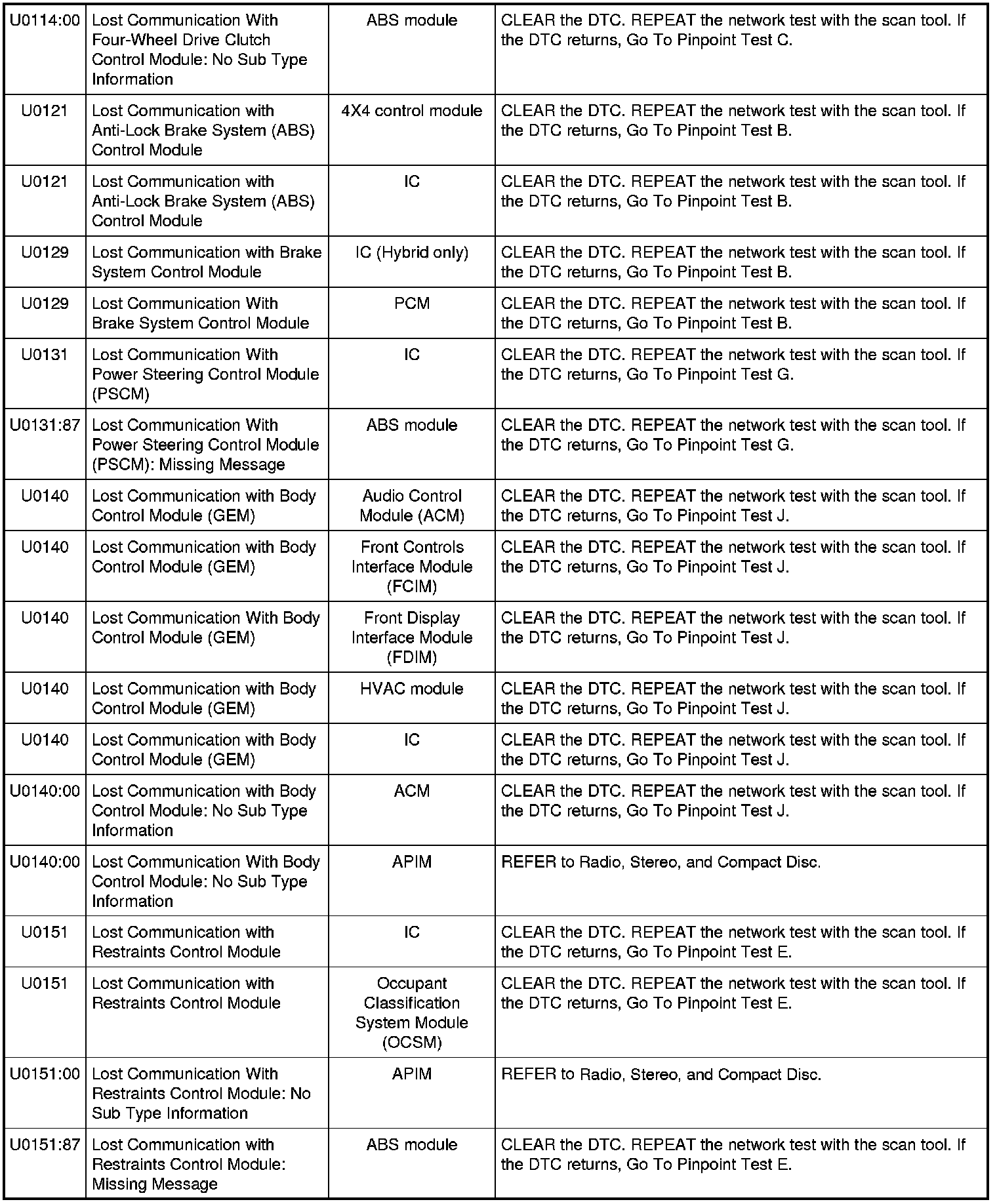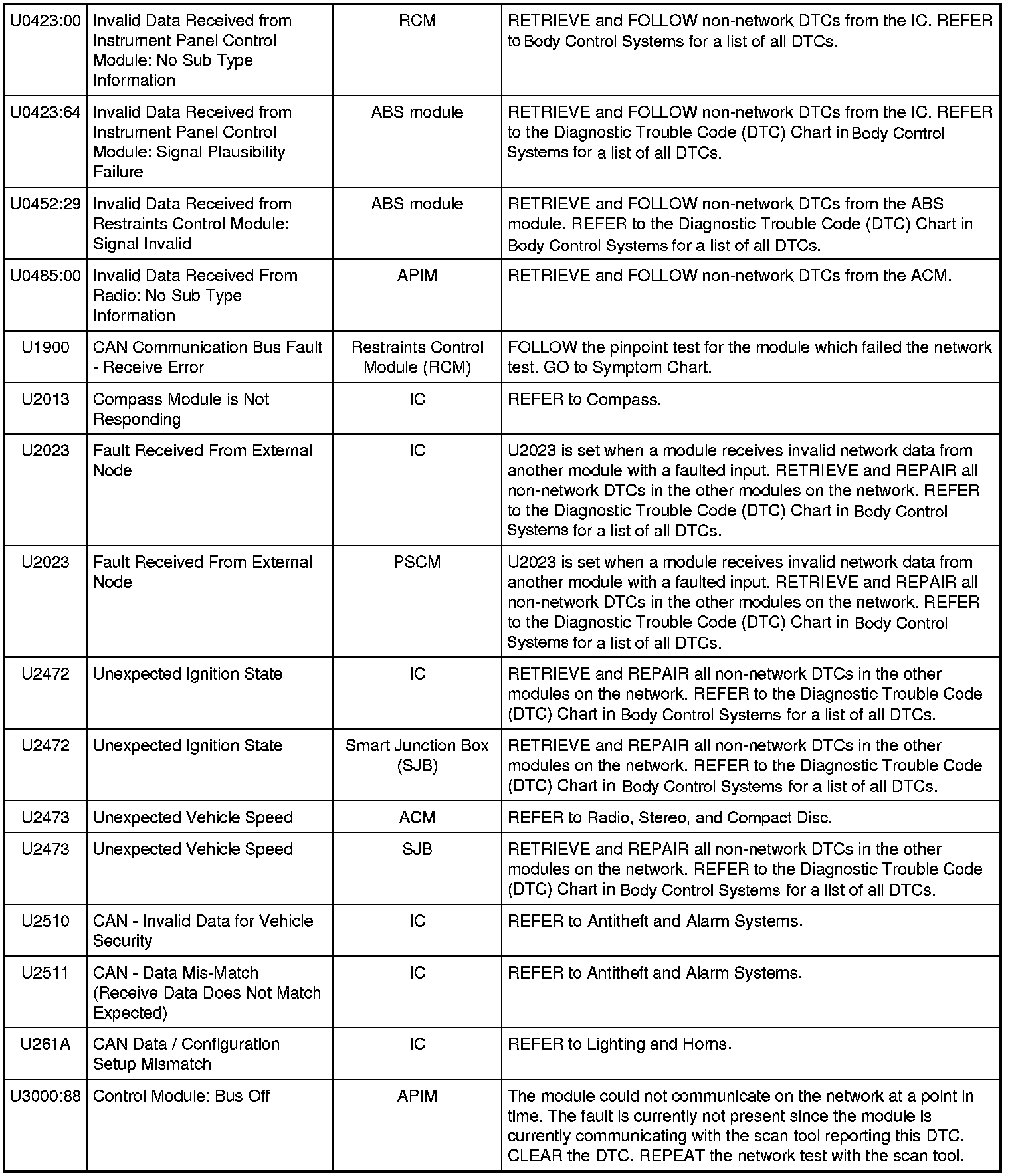 NOTE: Network DTCs (U-codes) are often a result of intermittent concerns such as faulty wiring or low battery voltage occurrences. Additionally, vehicle service procedures such as module reprogramming will often set network DTCs. Replacing a module to resolve a network DTC is unlikely to resolve the concern. To prevent repeat network DTC concerns, inspect all network wiring, especially connectors. Test the vehicle battery, refer to Battery.