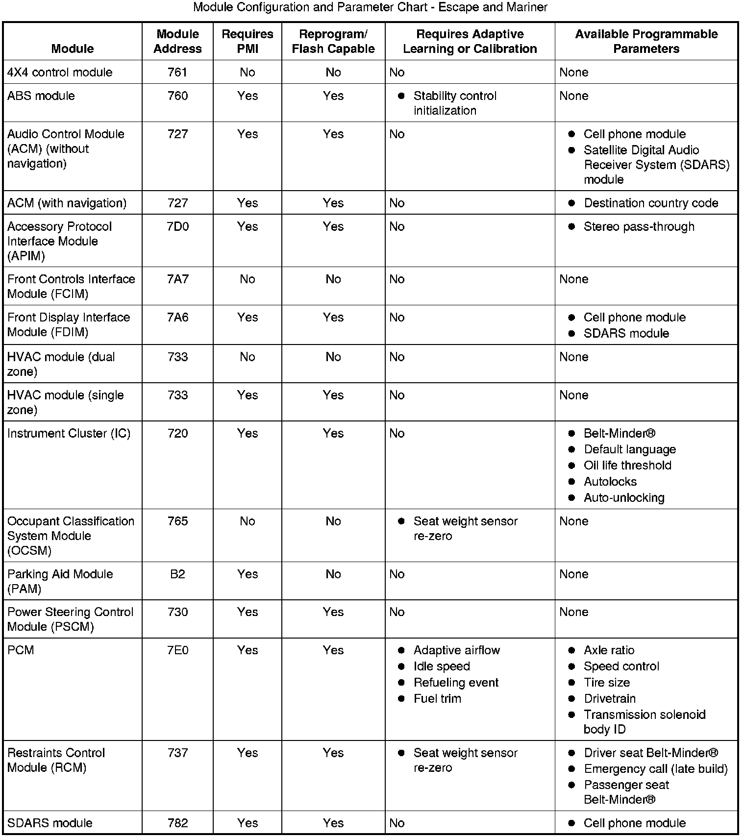 Module Configuration and Parameter Chart - Escape and Mariner (Part 1):