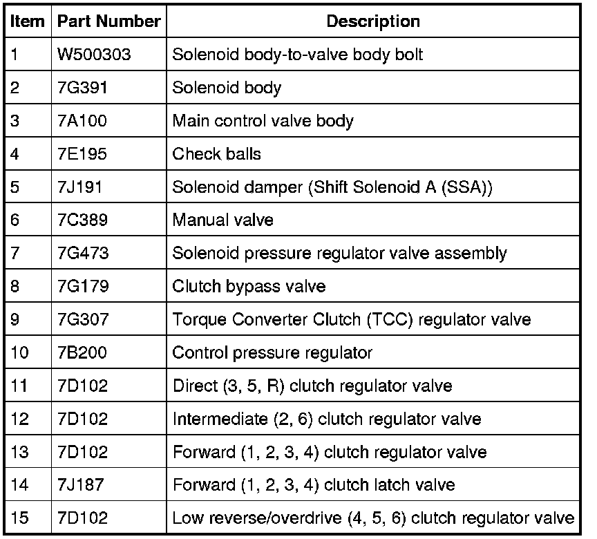 Compress the valve springs with a screwdriver and remove the retainers with a magnet. Use a pick to remove the bypass valve retainer. Remove the individual valves and springs from the main control valve body by tapping the valve body on the palm of the hand to slide the valves out of the bores. If needed, use a 4-mm bolt to thread into the valves to remove the valves. See the Valve Body illustration for valve and spring locations. Clean valves, springs and main control valve body.