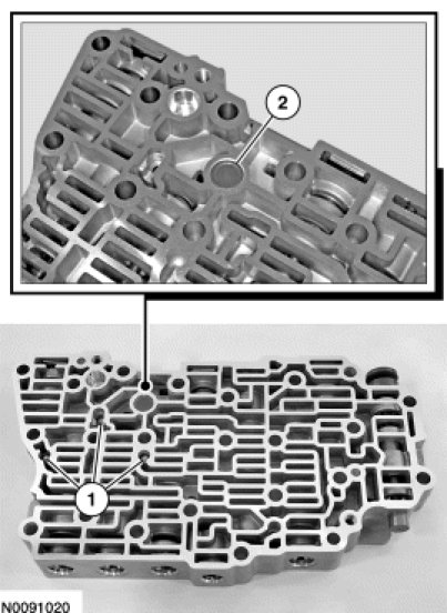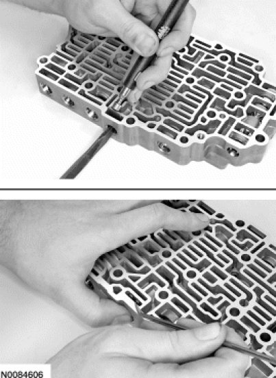 4. NOTICE: Remove the valves by tapping the valve body on the palm of the hand to slide the valves out of the bores or by threading a 4-mm bolt into the valves and pulling them out. It may be necessary to remove the valves and springs using a pick. If it is necessary to use a pick, use extreme caution to prevent damaging the valves or valve bores. If necessary, disassemble parts of the main control valve body in small groups. Take special care when handling the main control components, since they are the most precise and delicate parts of the transaxle. Neatly arrange the parts as they are removed to avoid mixing similar pieces.