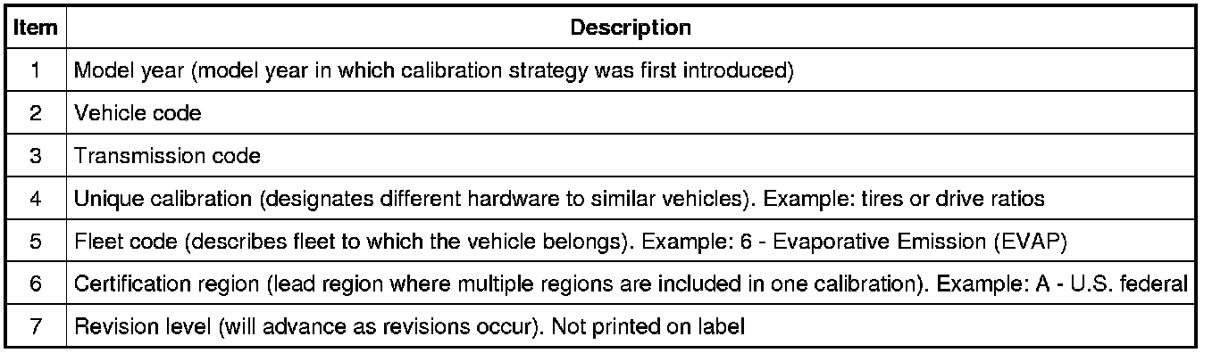 NOTE: Powertrain calibration information is limited to a maximum of 5 characters per line on the Vehicle Certification (VC) label. Because of this, calibration identification consisting of more than 5 characters will wrap to the second line on the VC label.