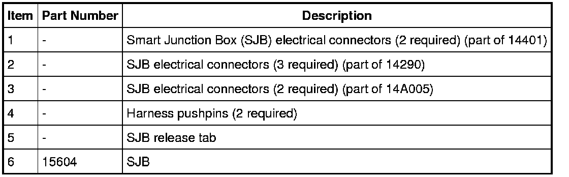 NOTE: The steps included in the SJB removal and installation procedure are critical to restoring the vehicle security and the TPMS to normal operation. A new SJB is delivered in a manufacturing mode with 7 pre-set DTCs related to the TPMS. To clear the DTCs, successful configuration of the SJB must occur, followed by successful TPMS sensor training, and a successful self-test, including clearing of the DTCs. The DTCs are as follows: