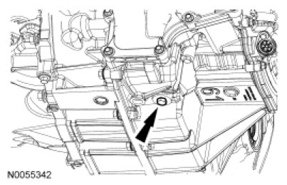 14. Remove and discard the transmission fluid cooler tube bolt and remove the transmission fluid cooler tube.