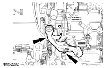9. Position aside the coolant hoses from the transmission fluid filler tube.