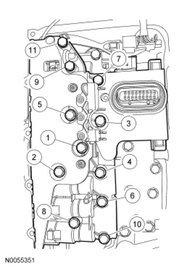 7. NOTICE: Make sure not to pinch the Turbine Shaft Speed (TSS), Output Shaft Speed (OSS) or Transmission Range (TR) sensor wiring harnesses when installing the solenoid body. Damage to the wiring harness will occur.