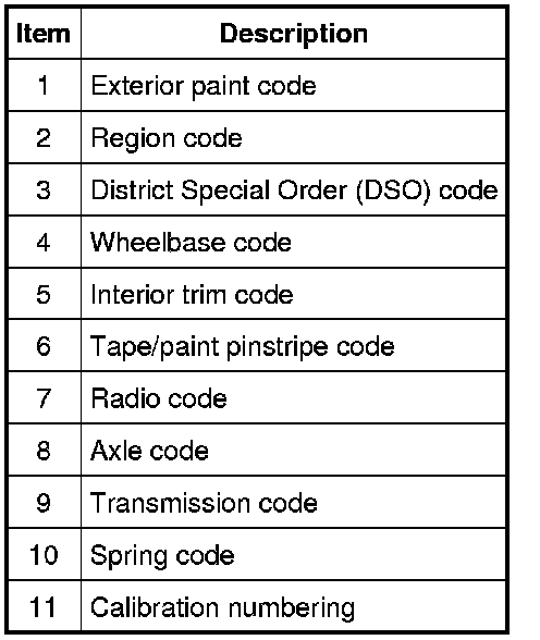 Interior trim codes are listed as a 2-part code. The first code listed identifies the trim level. The second code listed identifies the interior trim color.