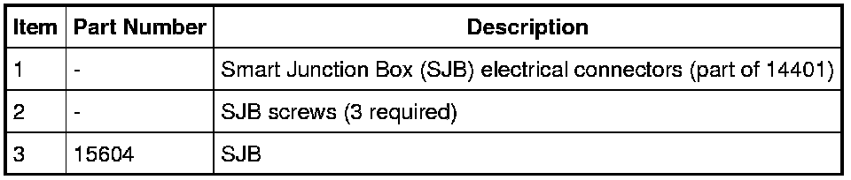NOTE: The steps included in the SJB removal and installation procedure are critical to restoring the tire pressure monitoring system to normal operation. A new SJB is delivered in a manufacturing mode with 7 pre-set TPMS DTCs. To clear the DTCs, successful configuration of the SJB must occur, followed by successful TPMS sensor training, and a successful self-test, including clearing of the DTCs. The DTCs are as follows:
