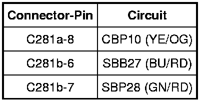 - Measure the resistance between the 4X4 control module C281a-10, circuit VDB04 (WH/BU), harness side and the Data Link Connector (DLC) C251-6, circuit VDB04 (WH/BU), harness side.
