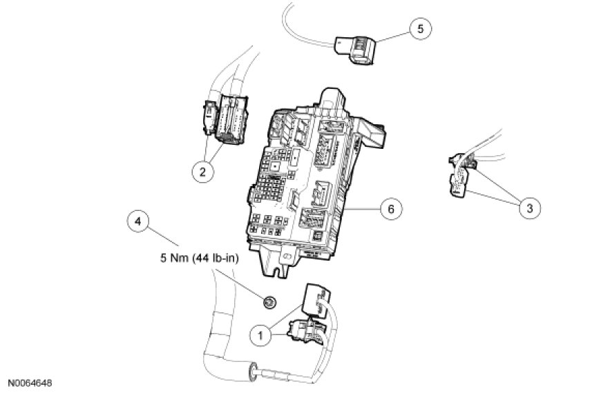 NOTE: Prior to the replacement of the module, it is necessary to upload the module configuration information to the appropriate scan tool. This information must be downloaded into the new module after installation. For additional information, refer to Information Bus. In the event that As-Built data entry is required (the Smart Junction Box (SJB) does not communicate), all Remote Keyless Entry (RKE) devices must be programmed to the new SJB. A minimum of 2 devices are necessary to complete the configuration and turn off the flashing interior lights.