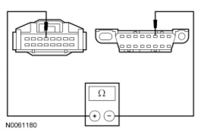 - Measure the resistance between the 4X4 control module C281-12, circuit VDB05 (WH), harness side and the DLC C251-14, circuit VDB05 (WH), harness side.