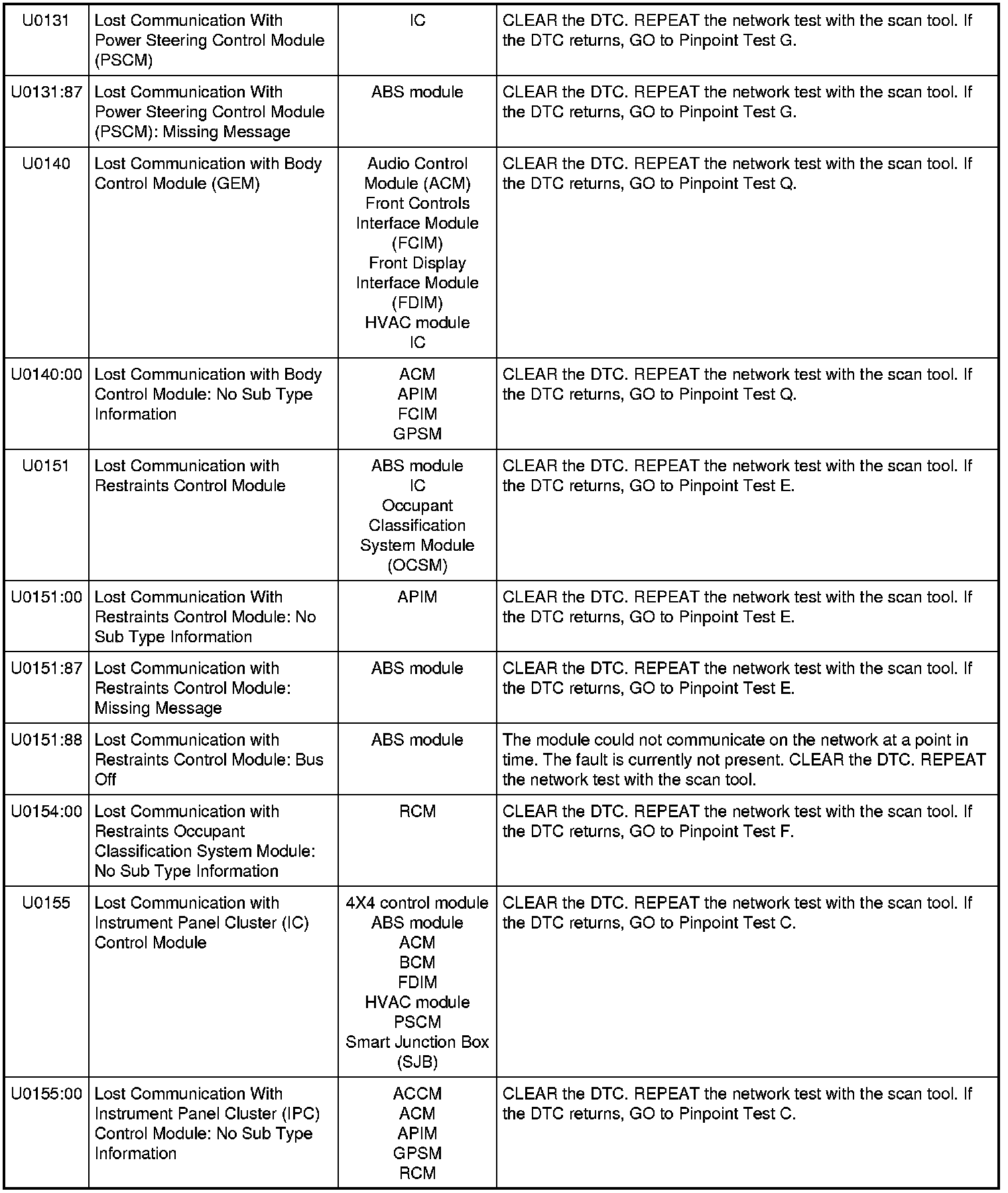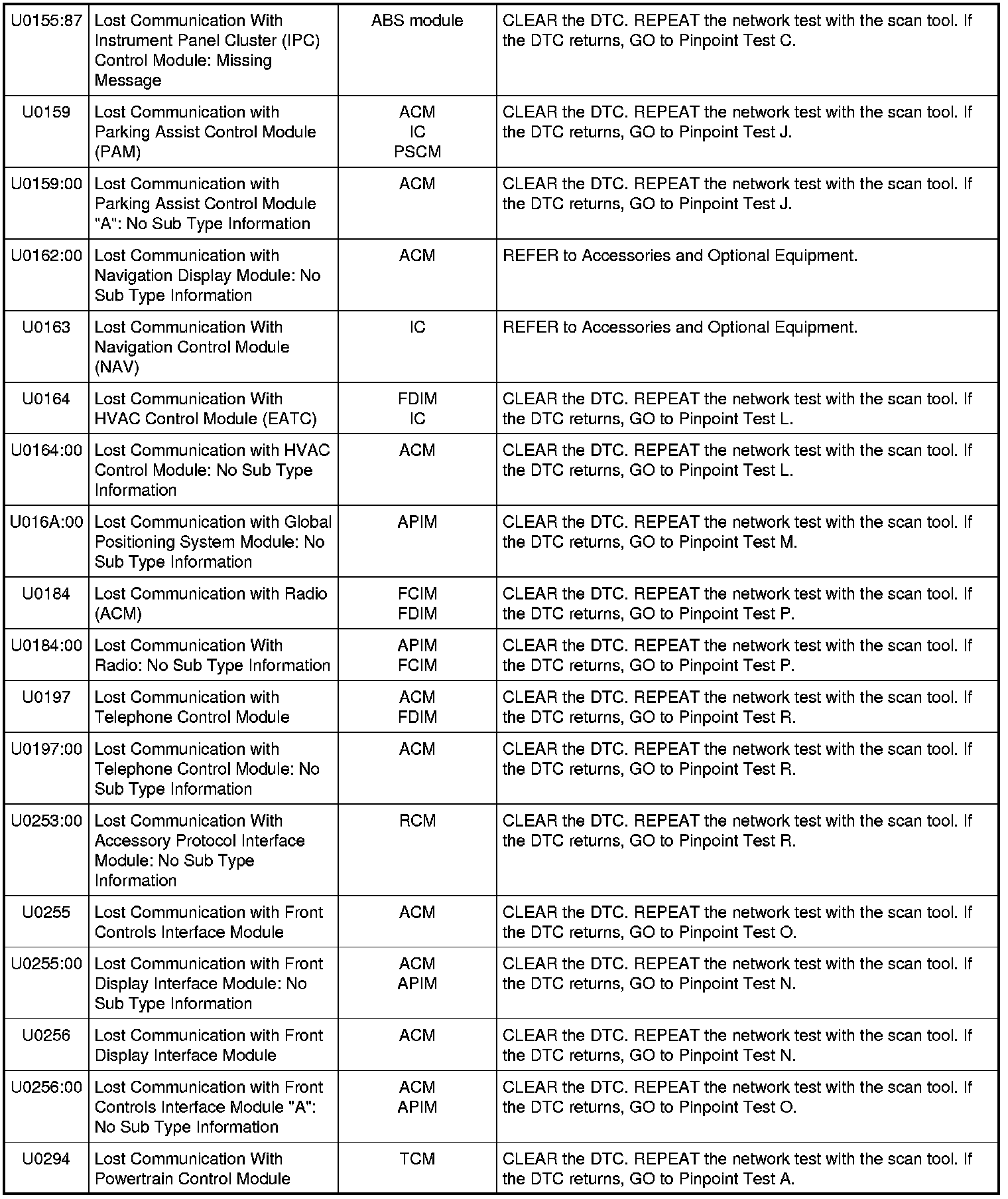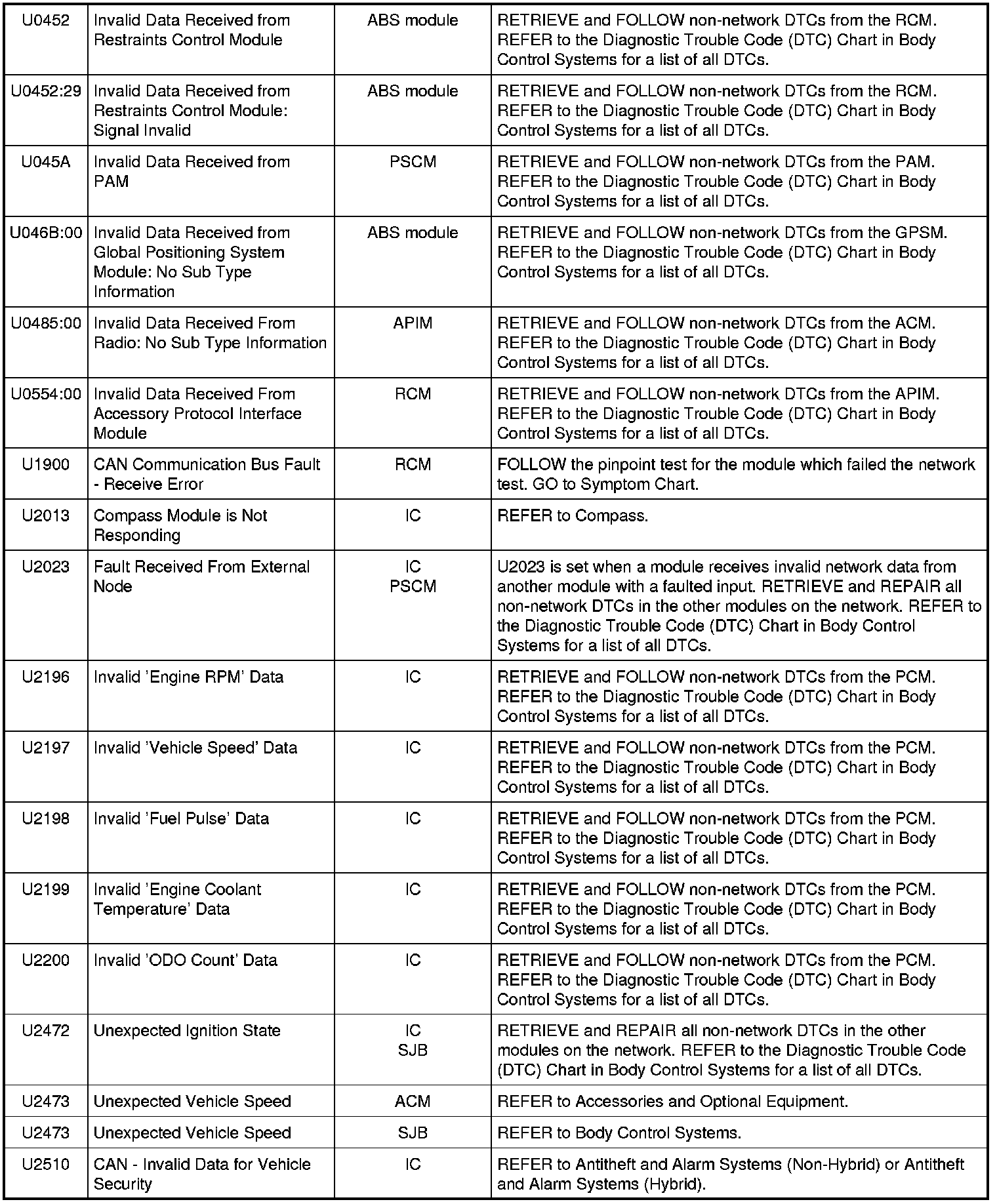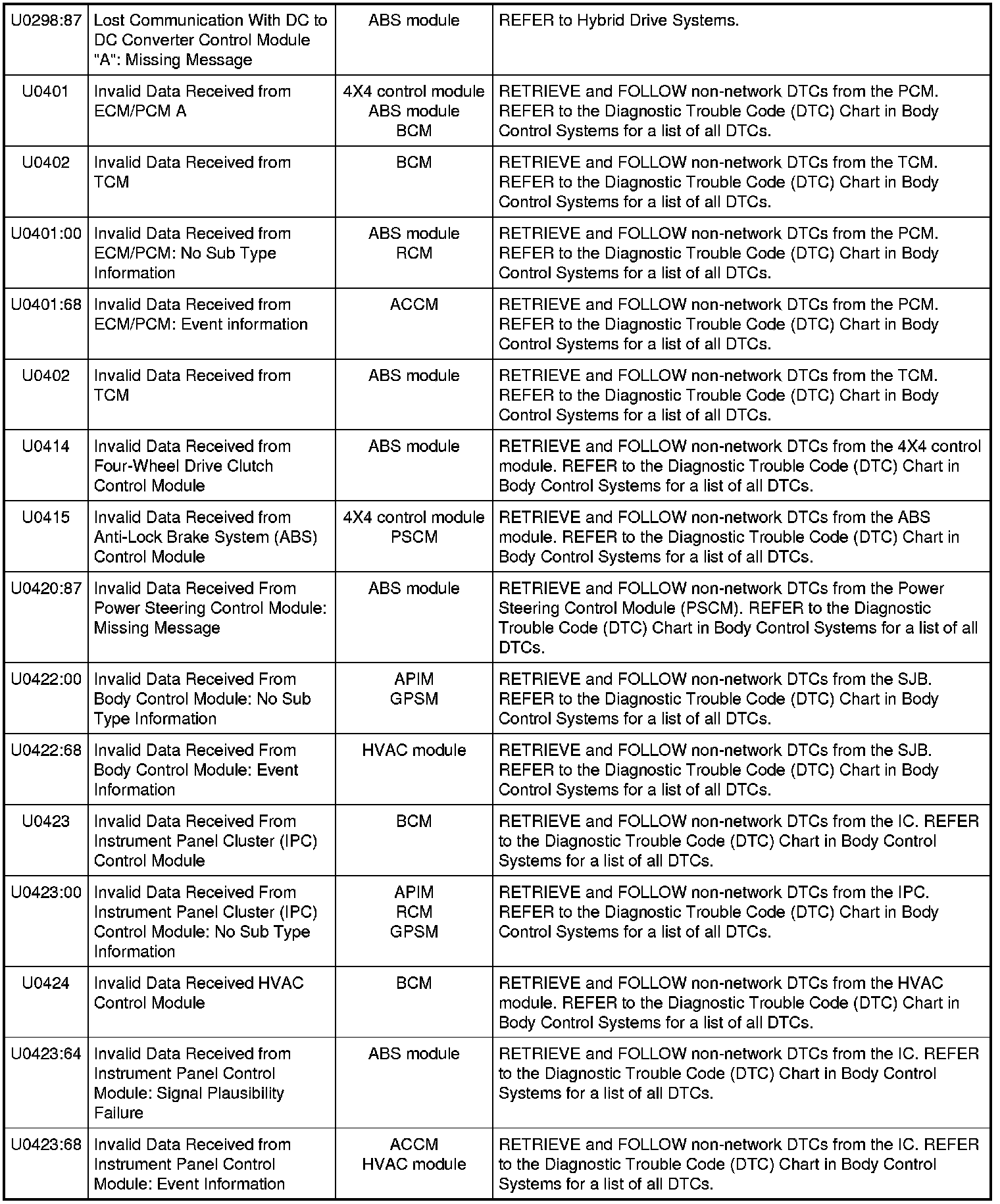 NOTE: Network DTCs (U-codes) are often a result of intermittent concerns such as damaged wiring or low battery voltage occurrences. Additionally, vehicle repair procedures such as module reprogramming often set network DTCs. Replacing a module to resolve a network DTC is unlikely to resolve the concern. To prevent repeat network DTC concerns, inspect all network wiring, especially connectors. Test the vehicle battery, refer to Battery.