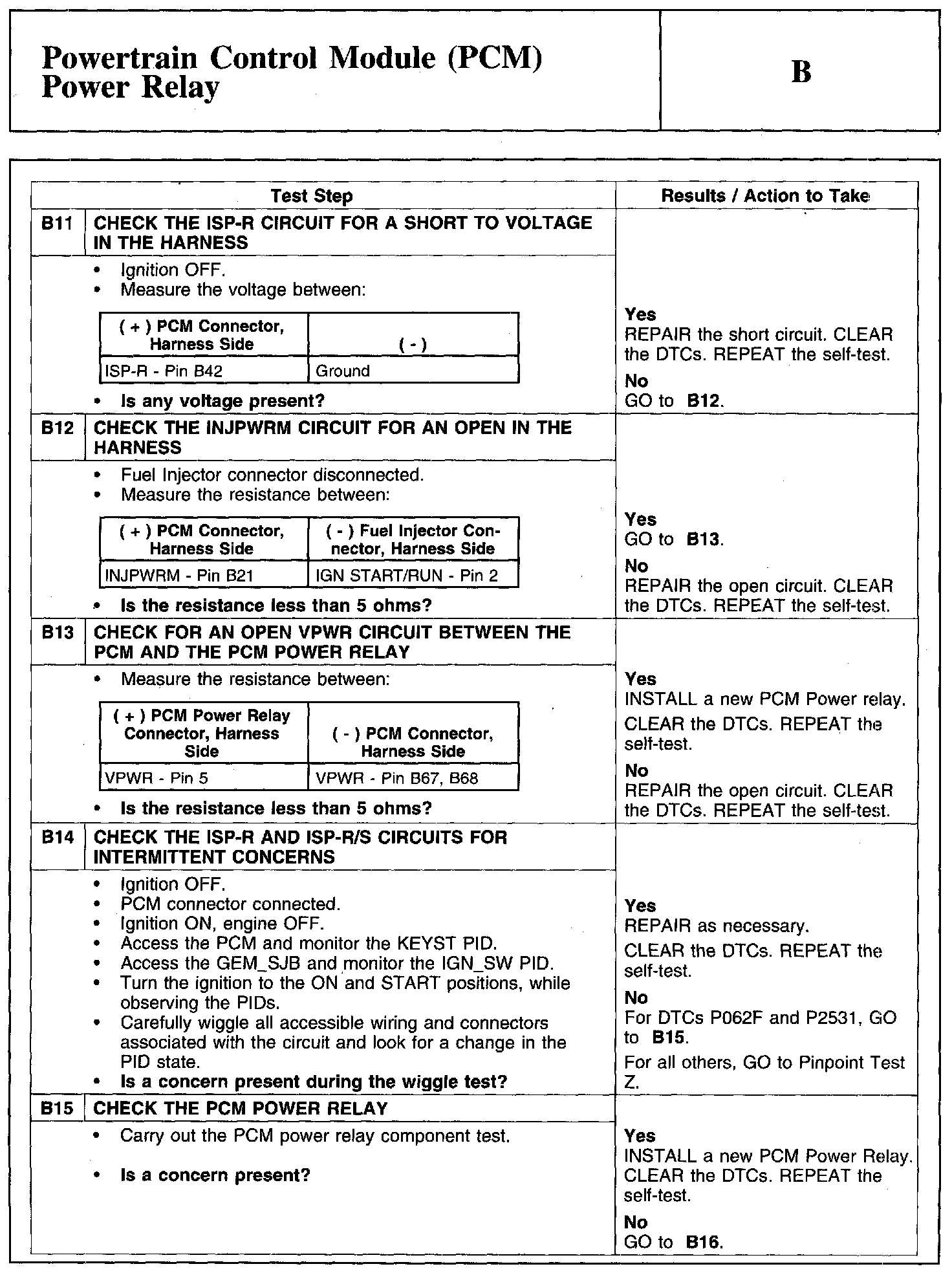 PINPOINT TEST B: POWERTRAIN CONTROL MODULE (PCM) POWER RELAYWarning And Fuel Injector Connector: