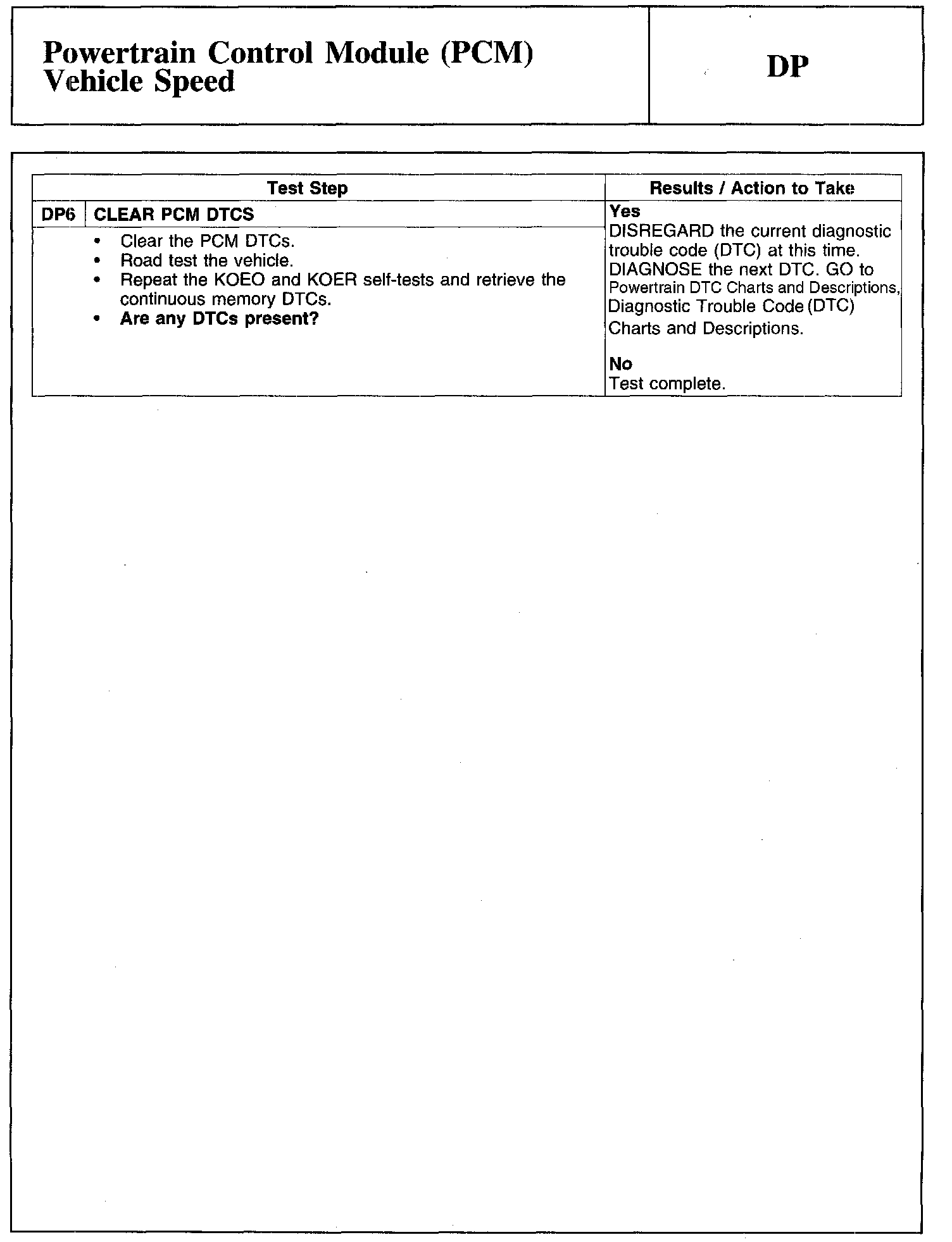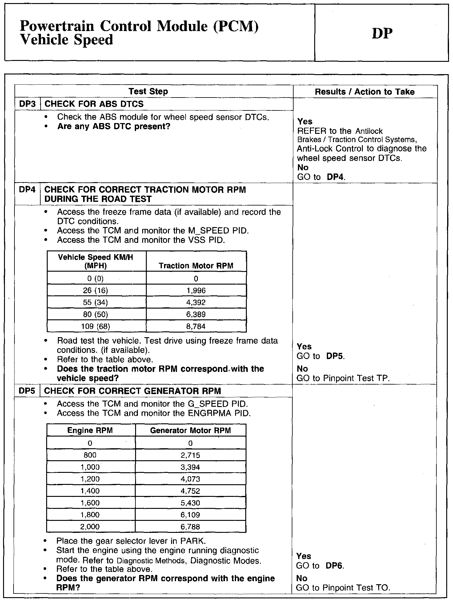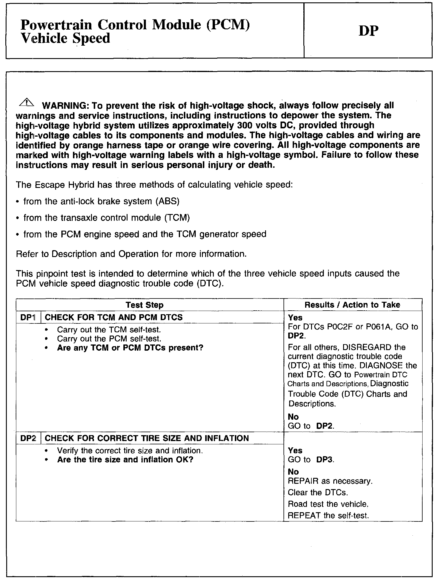 Test DP: Powertrain Control Module (PCM) Vehicle Speed