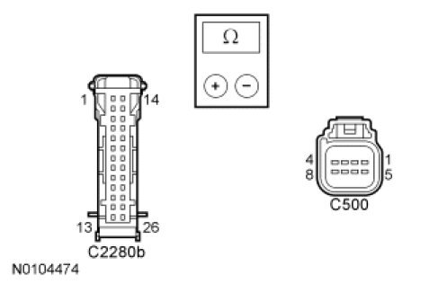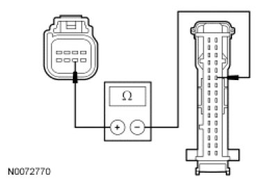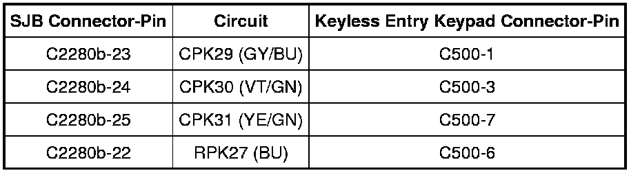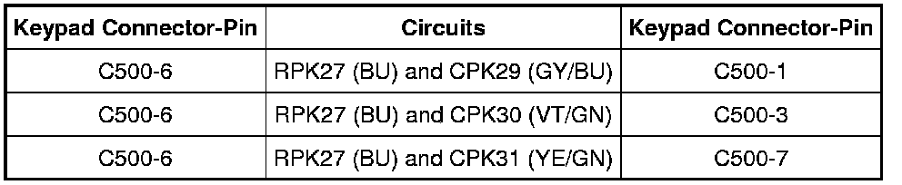- Measure the resistance between the keyless entry keypad C500-6, circuit RPK27 (BU), harness side and the SJB C2280b-22, circuit RPK27 (BU), harness side.