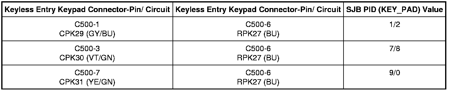 - Connect a fused jumper wire between the keyless entry keypad harness side, while monitoring the SJB PID (KEY_PAD) as follows: